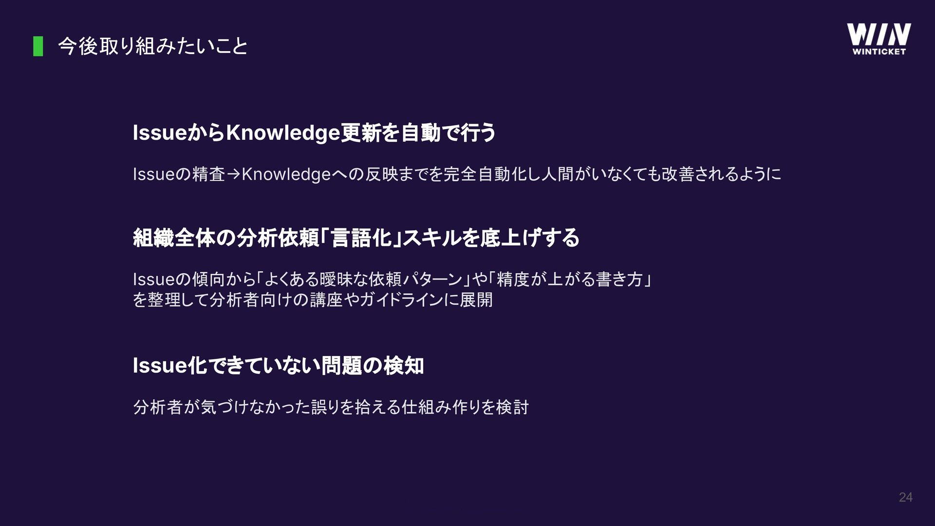 今後取り組みたいこと 24 組織全体の分析依頼「言語化」スキルを底上げする Issueの傾向から「よくある曖昧な依頼パターン」や「精度が上がる書き方」 を整理して分析者向けの講座やガイドラインに展開 Issue化できていない問題の検知 分析者が気づけなかった誤りを拾える仕組み作りを検討 IssueからKnowledge更新を自動で行う Issueの精査Knowledgeへの反映までを完全自動化し人間がいなくても改善されるように