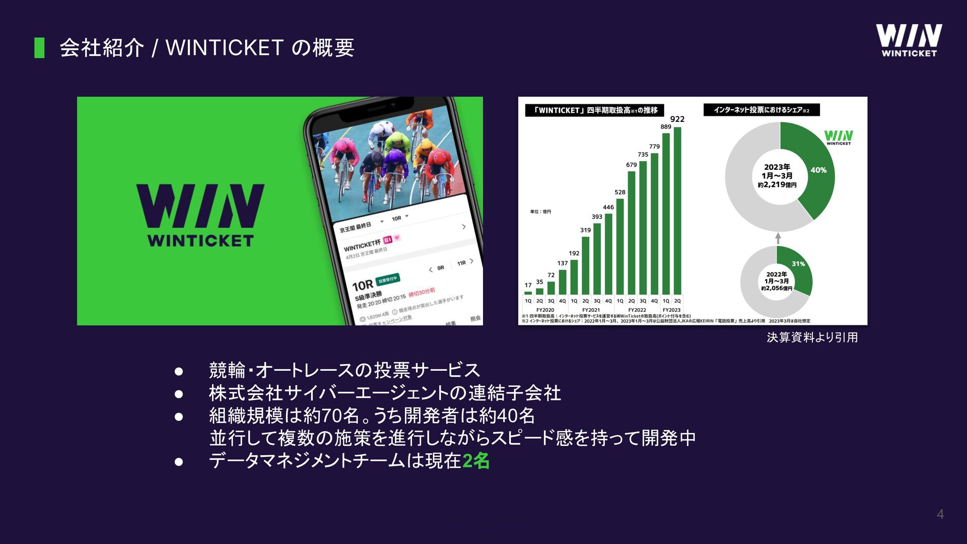 4 会社紹介 / WINTICKET の概要 • 競輪・オートレースの投票サービス • 株式会社サイバーエージェントの連結子会社 •