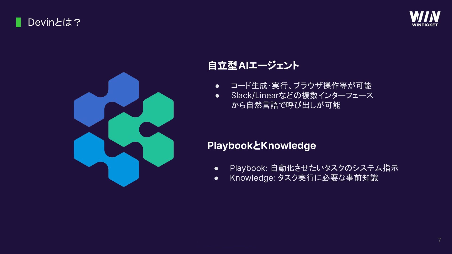 7 Devinとは? 自立型AIエージェント PlaybookとKnowledge • コード生成・実行、ブラウザ操作等が可能 • Slack/Linearなどの複数インターフェース から自然言語で呼び出しが可能 •