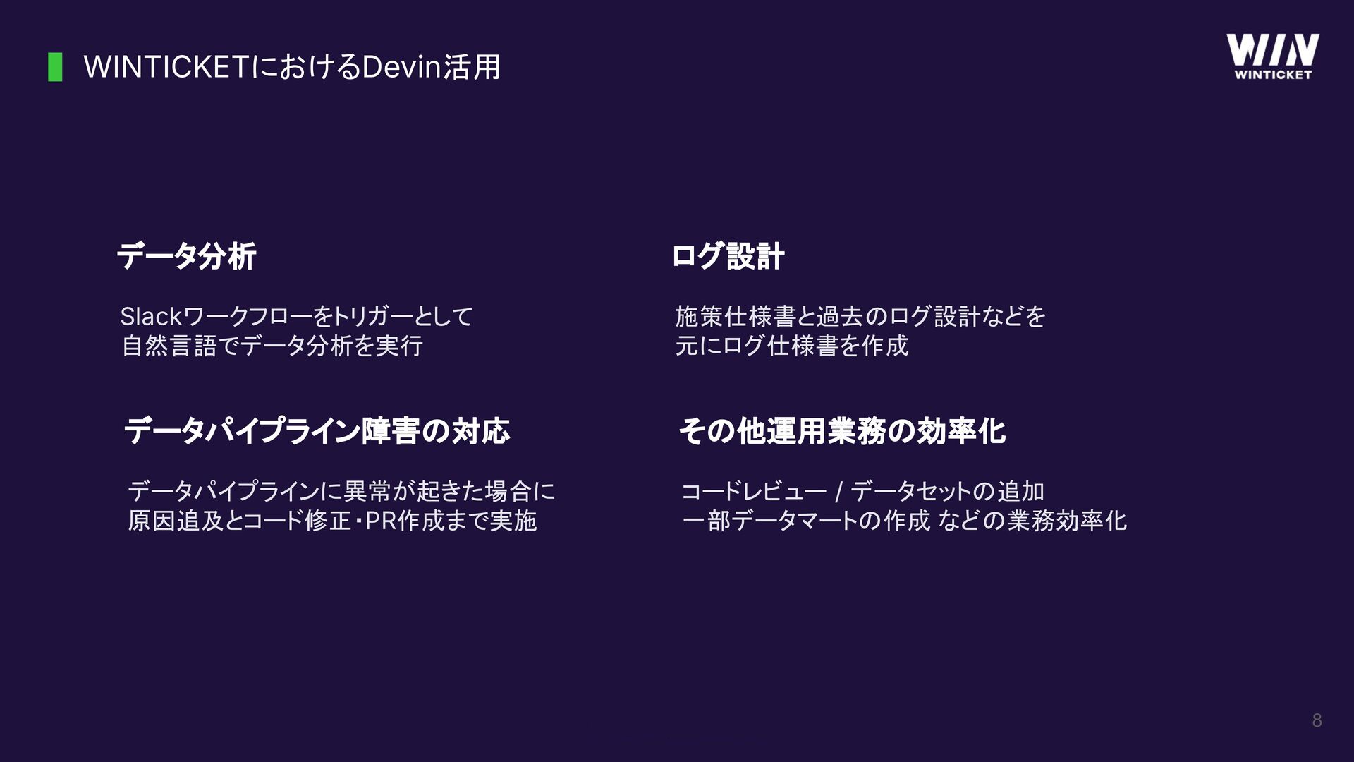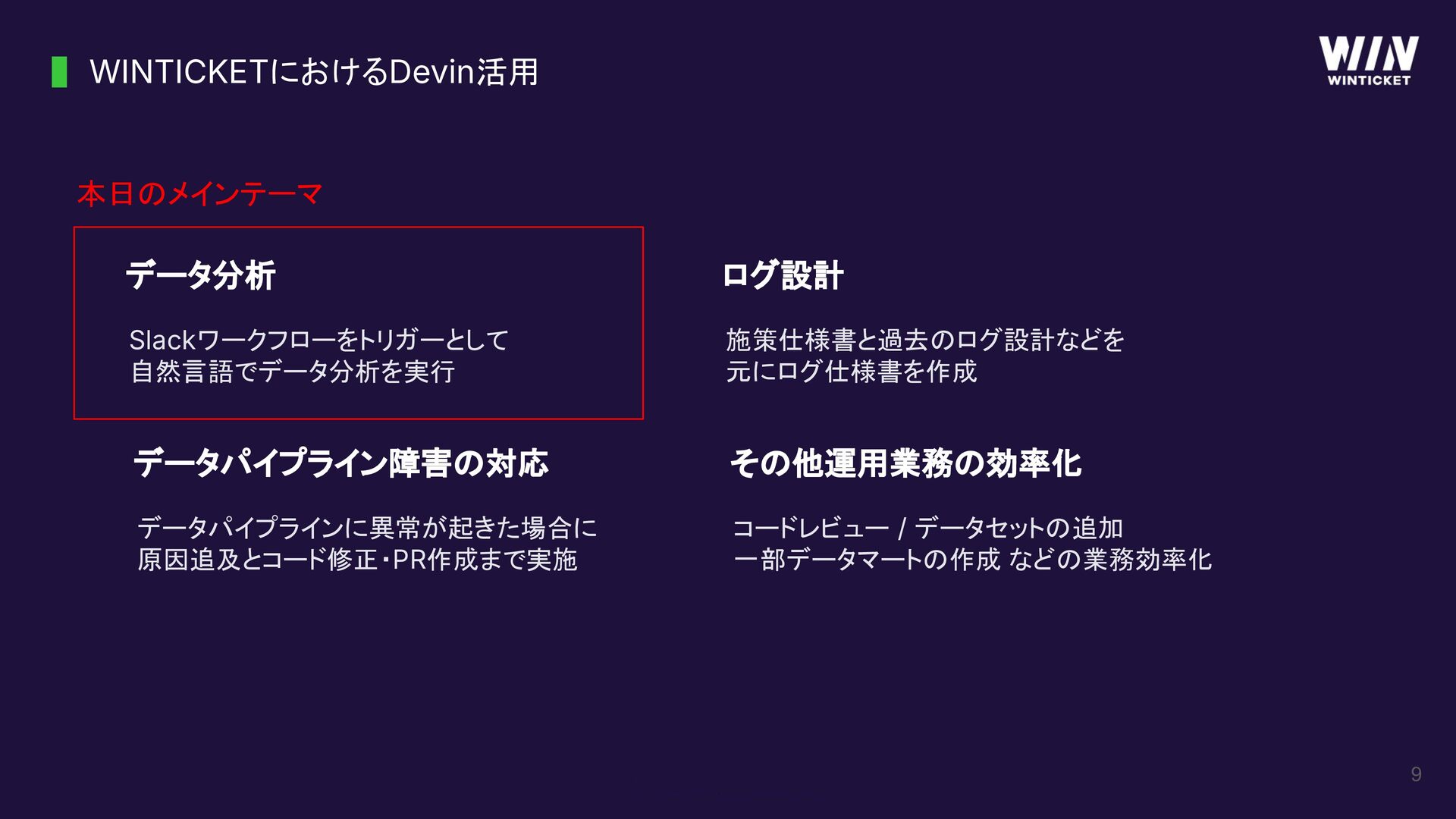 8 WINTICKETにおけるDevin活用 データ分析 Slackワークフローをトリガーとして 自然言語でデータ分析を実行 データパイプライン障害の対応 データパイプラインに異常が起きた場合に 原因追及とコード修正・PR作成まで実施 ログ設計 施策仕様書と過去のログ設計などを