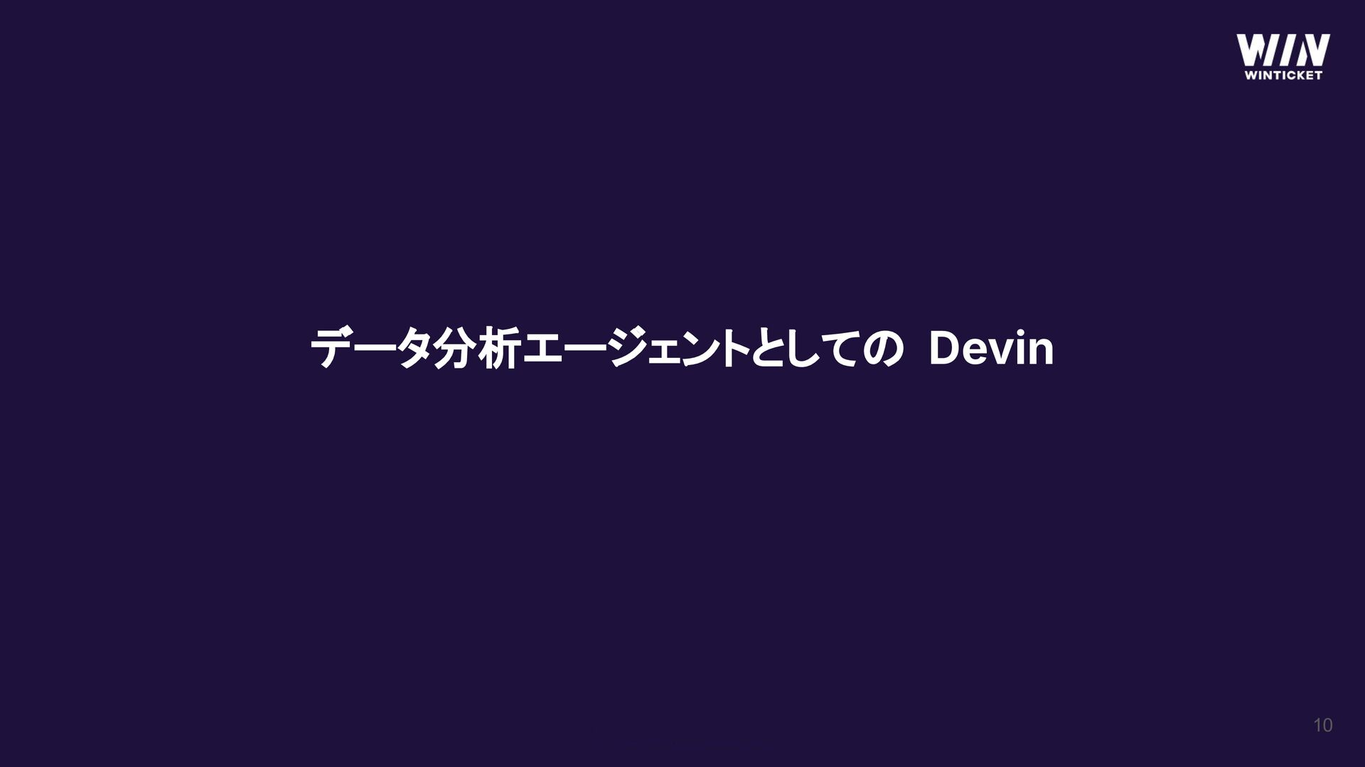 9 WINTICKETにおけるDevin活用 データ分析 Slackワークフローをトリガーとして 自然言語でデータ分析を実行 データパイプライン障害の対応 データパイプラインに異常が起きた場合に 原因追及とコード修正・PR作成まで実施 ログ設計 施策仕様書と過去のログ設計などを