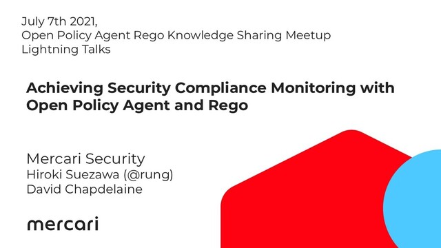 ◦ Need to analyze wide variety of audit and security logs from various sources. ◦ Need to use the policy engine for automated response. • OPA ◦ Able to manage Policy as code in Rego easily ◦ Unified way to write the policies in one language across different technologies. ◦ Testing and coverage support. ◦ Simple to deploy and maintain using GitOps ◦ Built-in Decision Logs. ◦ Ability to build complex responses and not just pass/fail. ◦ Strong adoption in the OSS community and Cloud Native Why OPA & Rego for security compliance