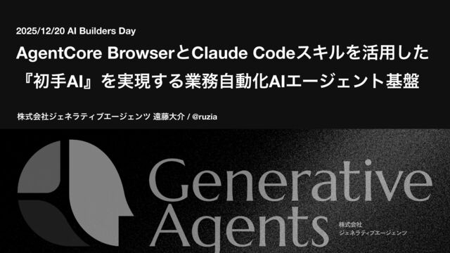 2025/12/20 AI Builders Day AgentCore BrowserͱClaude CodeεΩϧΛ׆༻ͨ͠ ʰॳखAIʱΛ࣮ݱ͢ΔۀࣗಈԽAIΤʔδΣϯτج൫ גࣜձࣾδΣωϥςΟϒΤʔδΣϯπ ԕ౻େհ