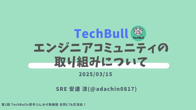 TechBull エンジニアコミュニティの 取り組みについて SRE 安達 涼(@adachin0817) 2025/03/15 第1回 TechBullx若手ふんわり勉強部 合同LT&交流会!
