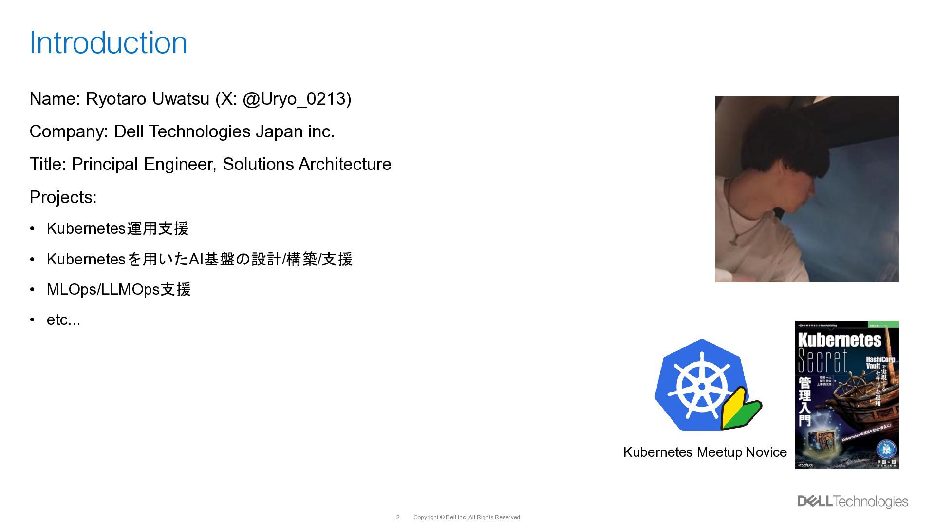 Ryotaro Uwatsu (X: @Uryo_0213) Company: Dell Technologies Japan inc. Title: Principal Engineer, Solutions Architecture Projects: • Kubernetes運用支援 • Kubernetesを用いたAI基盤の設計/構築/支援 • MLOps/LLMOps支援 • etc... Kubernetes Meetup Novice
