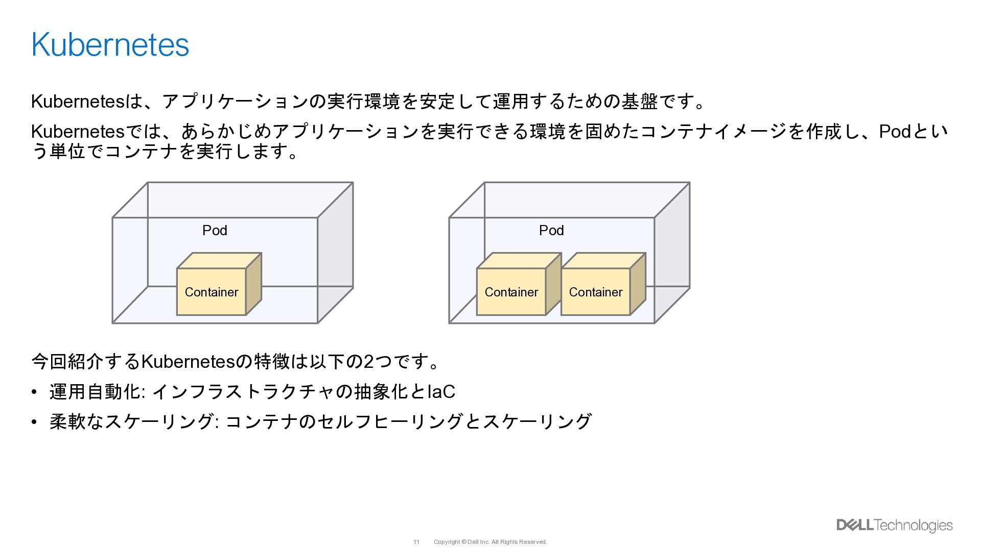 8. Copyright © Dell Inc. All Rights Reserved. 11 Kubernetes Kubernetesは、アプリケーションの実行環境を安定して運用するための基盤です。