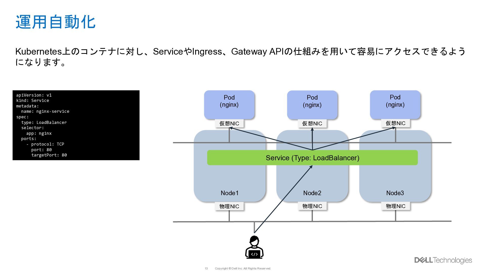 Pod (nginx) 運用自動化 Kubernetes上のコンテナに対し、ServiceやIngress、Gateway APIの仕組みを用いて容易にアクセスできるよう になります。 Node1 Node2 Node3 Pod (nginx) 物理NIC 物理NIC 物理NIC 仮想NIC 仮想NIC 仮想NIC apiVersion: v1 kind: Service metadata: name: nginx-service spec: type: LoadBalancer selector: app: nginx ports: - protocol: TCP port: 80 targetPort: 80 Service (Type: LoadBalancer)