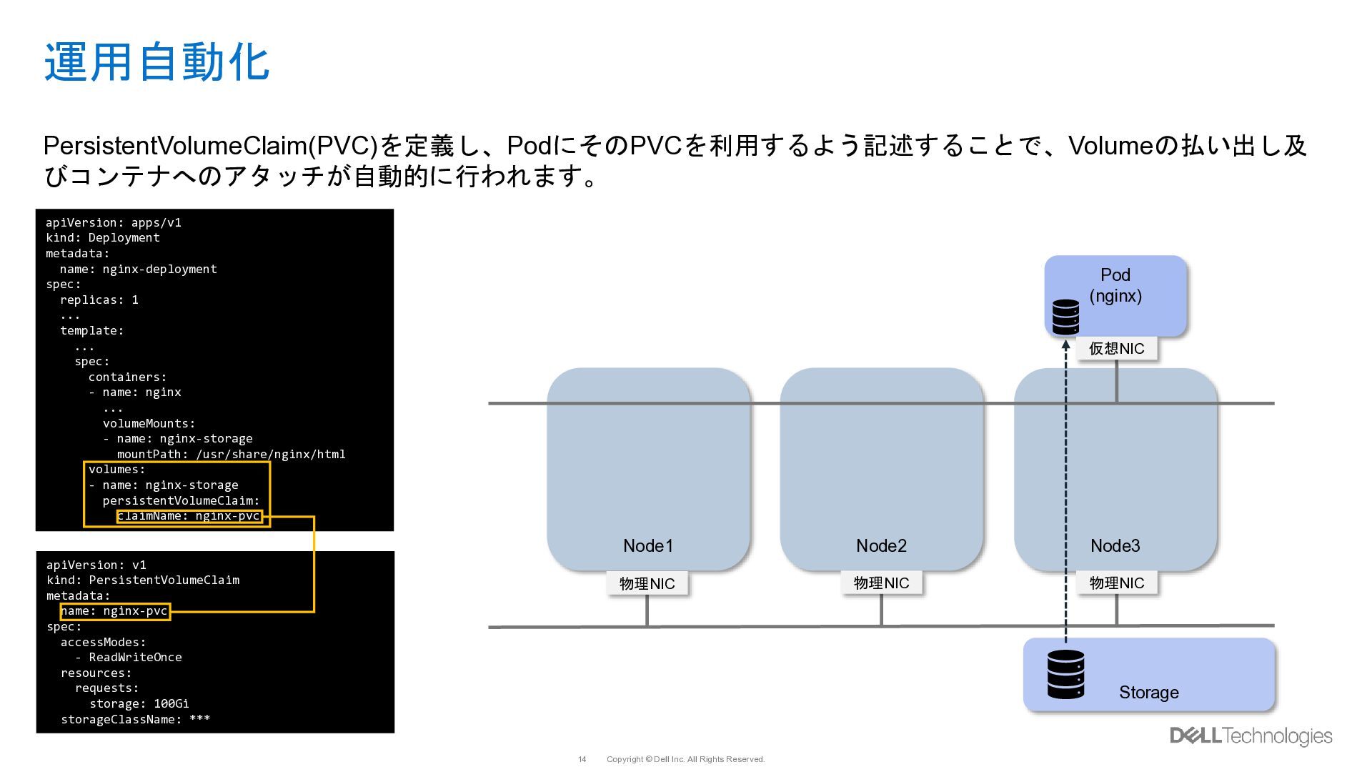 運用自動化 PersistentVolumeClaim(PVC)を定義し、PodにそのPVCを利用するよう記述することで、Volumeの払い出し及 びコンテナへのアタッチが自動的に行われます。 Node1 Node2 Node3 物理NIC 物理NIC 物理NIC 仮想NIC apiVersion: apps/v1 kind: Deployment metadata: name: nginx-deployment spec: replicas: 1 ... template: ... spec: containers: - name: nginx ... volumeMounts: - name: nginx-storage mountPath: /usr/share/nginx/html volumes: - name: nginx-storage persistentVolumeClaim: claimName: nginx-pvc Storage apiVersion: v1 kind: PersistentVolumeClaim metadata: name: nginx-pvc spec: accessModes: - ReadWriteOnce resources: requests: storage: 100Gi storageClassName: ***