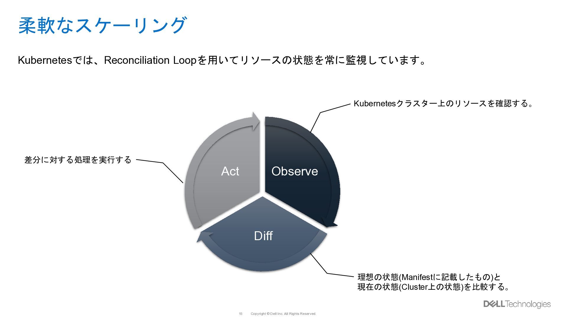 Diff Act Kubernetesクラスター上のリソースを確認する。 理想の状態(Manifestに記載したもの)と 現在の状態(Cluster上の状態)を比較する。 差分に対する処理を実行する Kubernetesでは、Reconciliation Loopを用いてリソースの状態を常に監視しています。