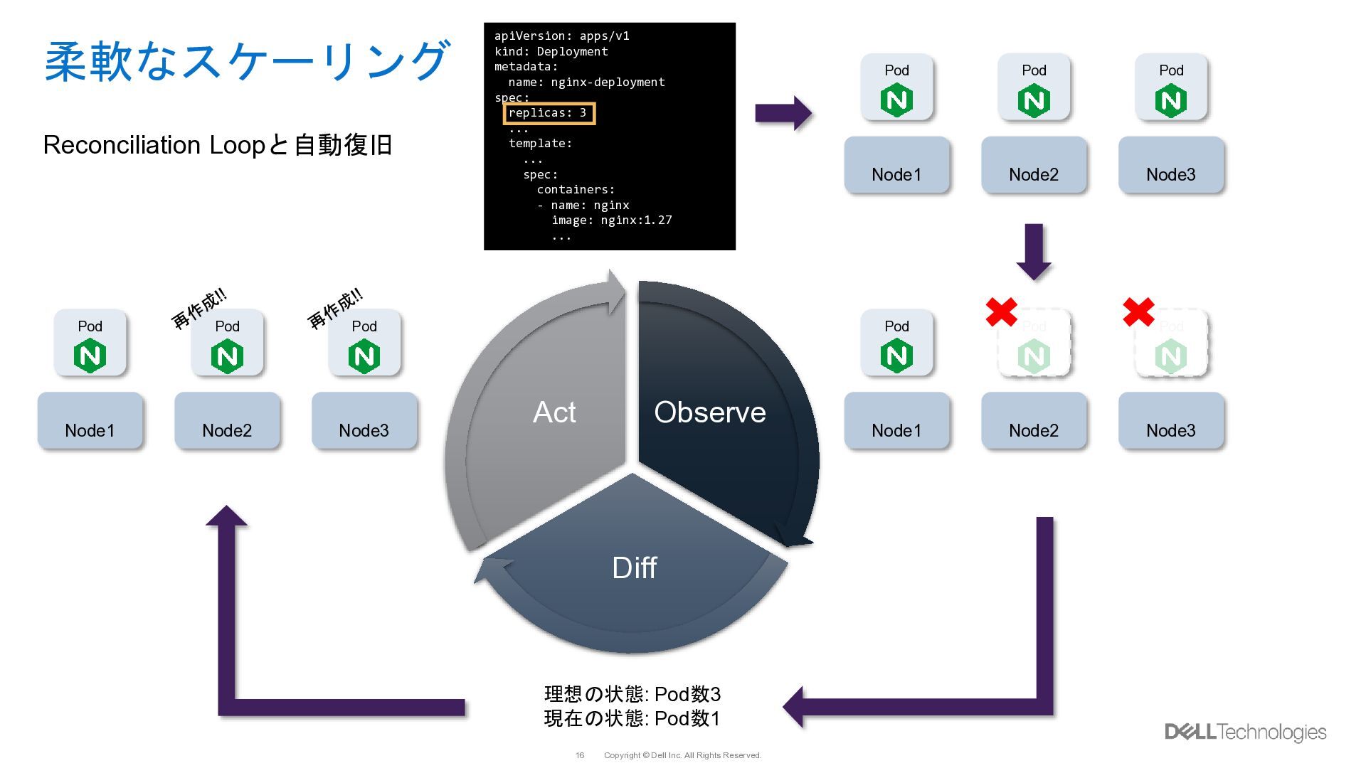 kind: Deployment metadata: name: nginx-deployment spec: replicas: 3 ... template: ... spec: containers: - name: nginx image: nginx:1.27 ... 柔軟なスケーリング Observe Diff Act Node1 Node2 Node3 Pod Pod Pod Node1 Node2 Node3 Pod Pod Pod 理想の状態: Pod数3 現在の状態: Pod数1 Node1 Node2 Node3 Pod Pod Pod Reconciliation Loopと自動復旧