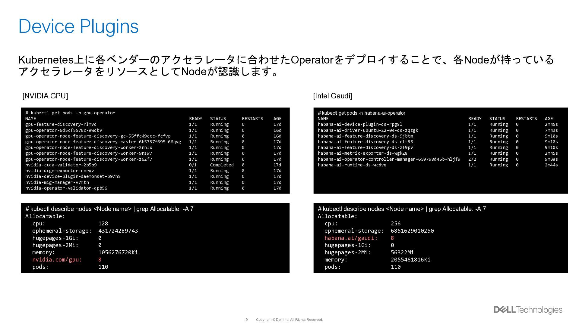 # kubectl describe nodes <Node name> | grep Allocatable: -A 7 Allocatable: cpu: 128 ephemeral-storage: 431724289743 hugepages-1Gi: 0 hugepages-2Mi: 0 memory: 1056276720Ki nvidia.com/gpu: 8 pods: 110 # kubectl describe nodes <Node name> | grep Allocatable: -A 7 Allocatable: cpu: 256 ephemeral-storage: 6851629010250 habana.ai/gaudi: 8 hugepages-1Gi: 0 hugepages-2Mi: 56322Mi memory: 2055461816Ki pods: 110 [NVIDIA GPU] [Intel Gaudi] # kubectl get pods -n habana-ai-operator NAME READY STATUS RESTARTS AGE habana-ai-device-plugin-ds-rpg8l 1/1 Running 0 2m45s habana-ai-driver-ubuntu-22-04-ds-zqzgk 1/1 Running 0 7m43s habana-ai-feature-discovery-ds-9jbtm 1/1 Running 0 9m10s habana-ai-feature-discovery-ds-nlt85 1/1 Running 0 9m10s habana-ai-feature-discovery-ds-zf9pv 1/1 Running 0 9m10s habana-ai-metric-exporter-ds-wgk28 1/1 Running 0 2m45s habana-ai-operator-controller-manager-659798d45b-hljf9 2/2 Running 0 9m38s habana-ai-runtime-ds-wcdvq 1/1 Running 0 2m44s # kubectl get pods -n gpu-operator NAME READY STATUS RESTARTS AGE gpu-feature-discovery-rlmvd 1/1 Running 0 17d gpu-operator-6d5cf5576c-9wdbv 1/1 Running 0 16d gpu-operator-node-feature-discovery-gc-55ffc49ccc-fcfvp 1/1 Running 0 16d gpu-operator-node-feature-discovery-master-6b5787f695-66qvg 1/1 Running 0 17d gpu-operator-node-feature-discovery-worker-2nnlx 1/1 Running 0 17d gpu-operator-node-feature-discovery-worker-9nsw7 1/1 Running 0 17d gpu-operator-node-feature-discovery-worker-z62f7 1/1 Running 0 17d nvidia-cuda-validator-2b5p9 0/1 Completed 0 17d nvidia-dcgm-exporter-rnrxv 1/1 Running 0 17d nvidia-device-plugin-daemonset-b97h5 1/1 Running 0 17d nvidia-mig-manager-v7mtn 1/1 Running 0 17d nvidia-operator-validator-qpb56 1/1 Running 0 17d Kubernetes上に各ベンダーのアクセラレータに合わせたOperatorをデプロイすることで、各Nodeが持っている アクセラレータをリソースとしてNodeが認識します。