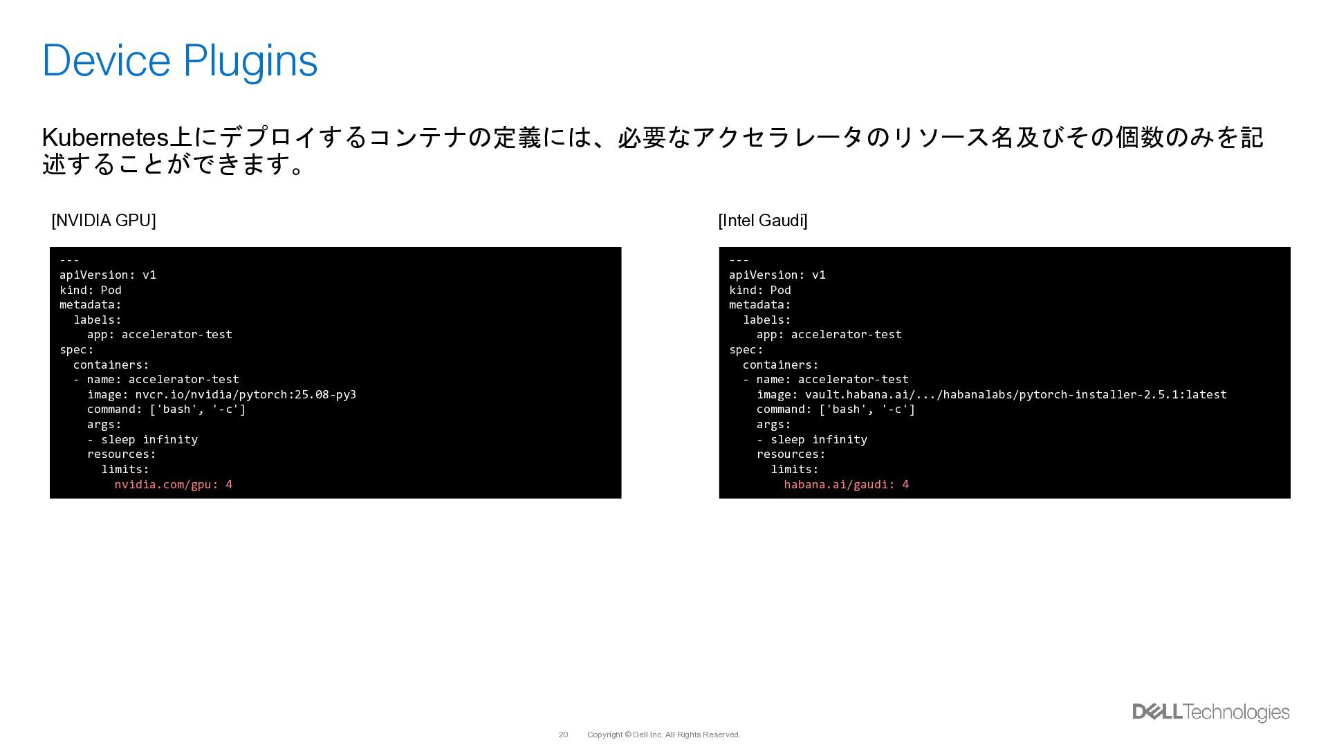 --- apiVersion: v1 kind: Pod metadata: labels: app: accelerator-test spec: containers: - name: accelerator-test image: nvcr.io/nvidia/pytorch:25.08-py3 command: ['bash', '-c'] args: - sleep infinity resources: limits: nvidia.com/gpu: 4 --- apiVersion: v1 kind: Pod metadata: labels: app: accelerator-test spec: containers: - name: accelerator-test image: vault.habana.ai/.../habanalabs/pytorch-installer-2.5.1:latest command: ['bash', '-c'] args: - sleep infinity resources: limits: habana.ai/gaudi: 4 Kubernetes上にデプロイするコンテナの定義には、必要なアクセラレータのリソース名及びその個数のみを記 述することができます。 [NVIDIA GPU] [Intel Gaudi]