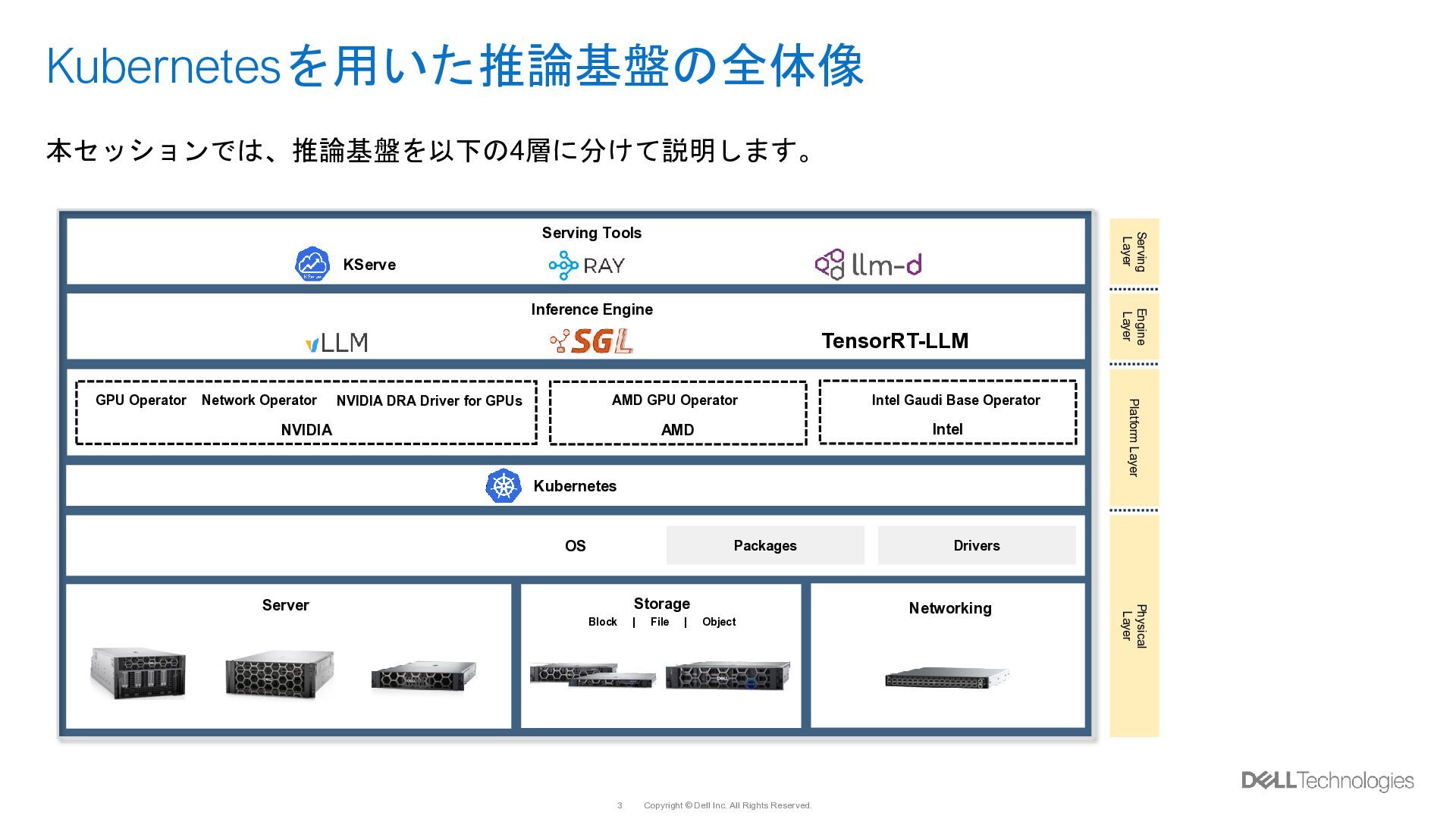 Block | File | Object Server Networking OS Kubernetes AMD GPU Operator Intel Gaudi Base Operator GPU Operator Network Operator NVIDIA AMD Intel NVIDIA DRA Driver for GPUs Packages Drivers Inference Engine TensorRT-LLM Serving Tools KServe Physical Layer Platform Layer Engine Layer Serving Layer 本セッションでは、推論基盤を以下の4層に分けて説明します。