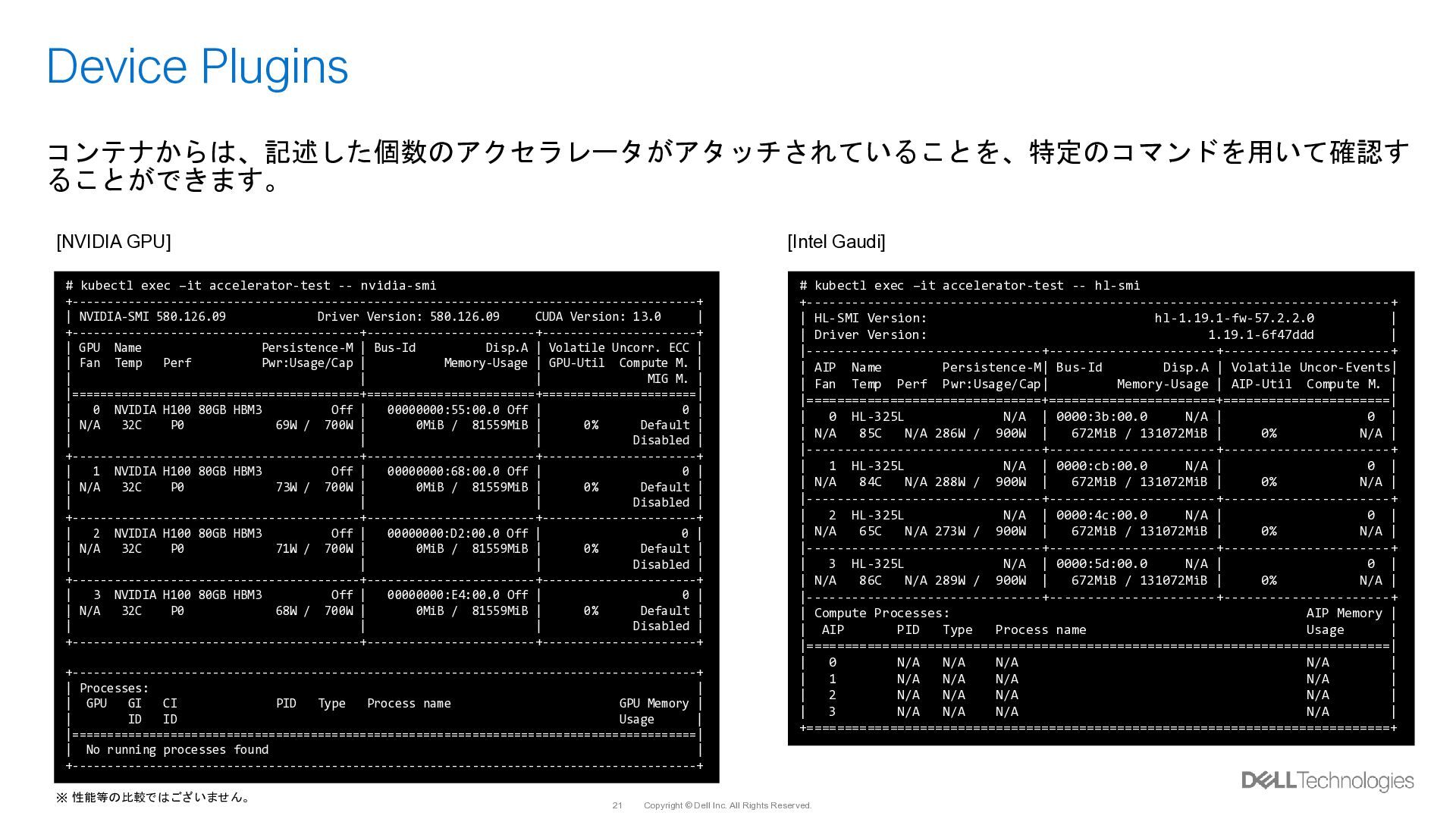 # kubectl exec –it accelerator-test -- nvidia-smi +-----------------------------------------------------------------------------------------+ | NVIDIA-SMI 580.126.09 Driver Version: 580.126.09 CUDA Version: 13.0 | +-----------------------------------------+------------------------+----------------------+ | GPU Name Persistence-M | Bus-Id Disp.A | Volatile Uncorr. ECC | | Fan Temp Perf Pwr:Usage/Cap | Memory-Usage | GPU-Util Compute M. | | | | MIG M. | |=========================================+========================+======================| | 0 NVIDIA H100 80GB HBM3 Off | 00000000:55:00.0 Off | 0 | | N/A 32C P0 69W / 700W | 0MiB / 81559MiB | 0% Default | | | | Disabled | +-----------------------------------------+------------------------+----------------------+ | 1 NVIDIA H100 80GB HBM3 Off | 00000000:68:00.0 Off | 0 | | N/A 32C P0 73W / 700W | 0MiB / 81559MiB | 0% Default | | | | Disabled | +-----------------------------------------+------------------------+----------------------+ | 2 NVIDIA H100 80GB HBM3 Off | 00000000:D2:00.0 Off | 0 | | N/A 32C P0 71W / 700W | 0MiB / 81559MiB | 0% Default | | | | Disabled | +-----------------------------------------+------------------------+----------------------+ | 3 NVIDIA H100 80GB HBM3 Off | 00000000:E4:00.0 Off | 0 | | N/A 32C P0 68W / 700W | 0MiB / 81559MiB | 0% Default | | | | Disabled | +-----------------------------------------+------------------------+----------------------+ +-----------------------------------------------------------------------------------------+ | Processes: | | GPU GI CI PID Type Process name GPU Memory | | ID ID Usage | |=========================================================================================| | No running processes found | +-----------------------------------------------------------------------------------------+ # kubectl exec –it accelerator-test -- hl-smi +-----------------------------------------------------------------------------+ | HL-SMI Version: hl-1.19.1-fw-57.2.2.0 | | Driver Version: 1.19.1-6f47ddd | |-------------------------------+----------------------+----------------------+ | AIP Name Persistence-M| Bus-Id Disp.A | Volatile Uncor-Events| | Fan Temp Perf Pwr:Usage/Cap| Memory-Usage | AIP-Util Compute M. | |===============================+======================+======================| | 0 HL-325L N/A | 0000:3b:00.0 N/A | 0 | | N/A 85C N/A 286W / 900W | 672MiB / 131072MiB | 0% N/A | |-------------------------------+----------------------+----------------------+ | 1 HL-325L N/A | 0000:cb:00.0 N/A | 0 | | N/A 84C N/A 288W / 900W | 672MiB / 131072MiB | 0% N/A | |-------------------------------+----------------------+----------------------+ | 2 HL-325L N/A | 0000:4c:00.0 N/A | 0 | | N/A 65C N/A 273W / 900W | 672MiB / 131072MiB | 0% N/A | |-------------------------------+----------------------+----------------------+ | 3 HL-325L N/A | 0000:5d:00.0 N/A | 0 | | N/A 86C N/A 289W / 900W | 672MiB / 131072MiB | 0% N/A | |-------------------------------+----------------------+----------------------+ | Compute Processes: AIP Memory | | AIP PID Type Process name Usage | |=============================================================================| | 0 N/A N/A N/A N/A | | 1 N/A N/A N/A N/A | | 2 N/A N/A N/A N/A | | 3 N/A N/A N/A N/A | +=============================================================================+ [NVIDIA GPU] [Intel Gaudi] コンテナからは、記述した個数のアクセラレータがアタッチされていることを、特定のコマンドを用いて確認す ることができます。 ※ 性能等の比較ではございません。