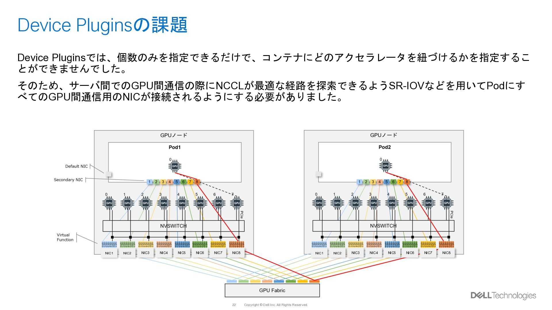 Device Pluginsでは、個数のみを指定できるだけで、コンテナにどのアクセラレータを紐づけるかを指定するこ とができませんでした。 そのため、サーバ間でのGPU間通信の際にNCCLが最適な経路を探索できるようSR-IOVなどを用いてPodにす べてのGPU間通信用のNICが接続されるようにする必要がありました。 NIC1 NIC2 NIC3 NIC4 NIC5 NIC6 NIC7 NIC8 NIC1 NIC2 NIC3 NIC4 NIC5 NIC6 NIC7 NIC8