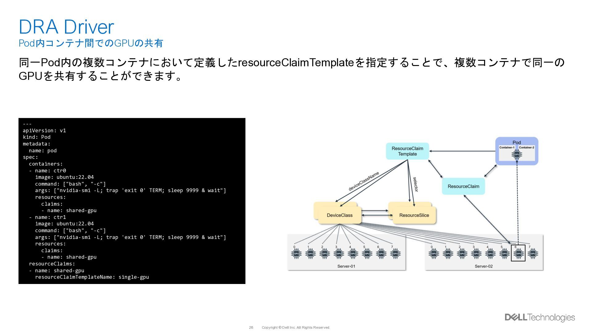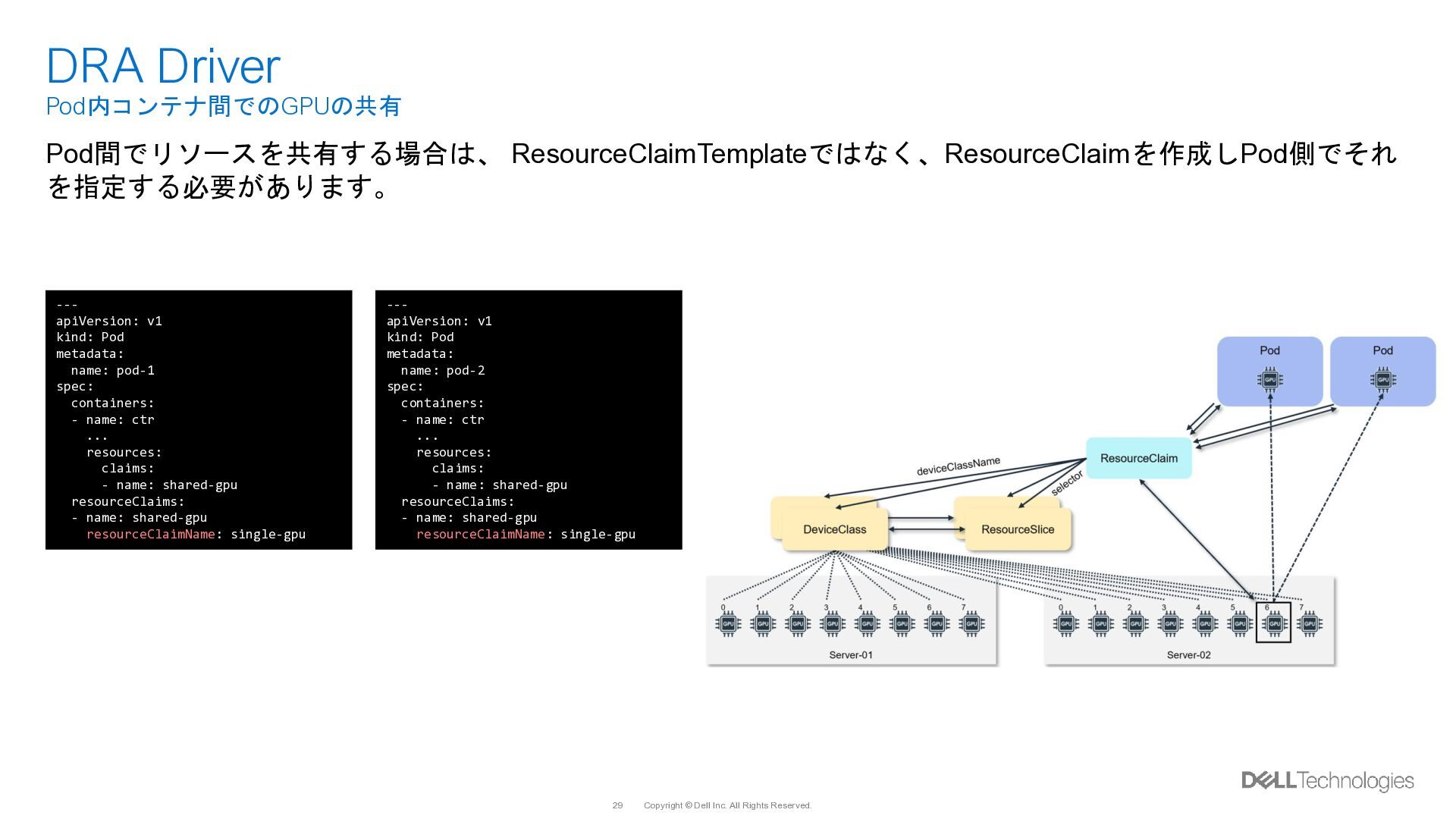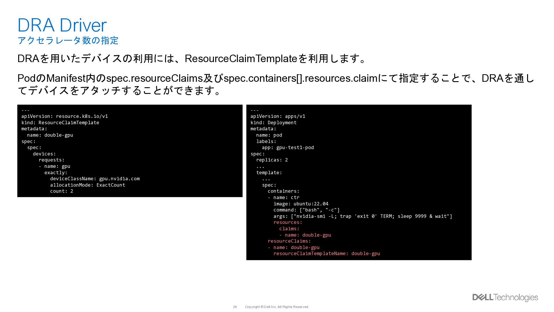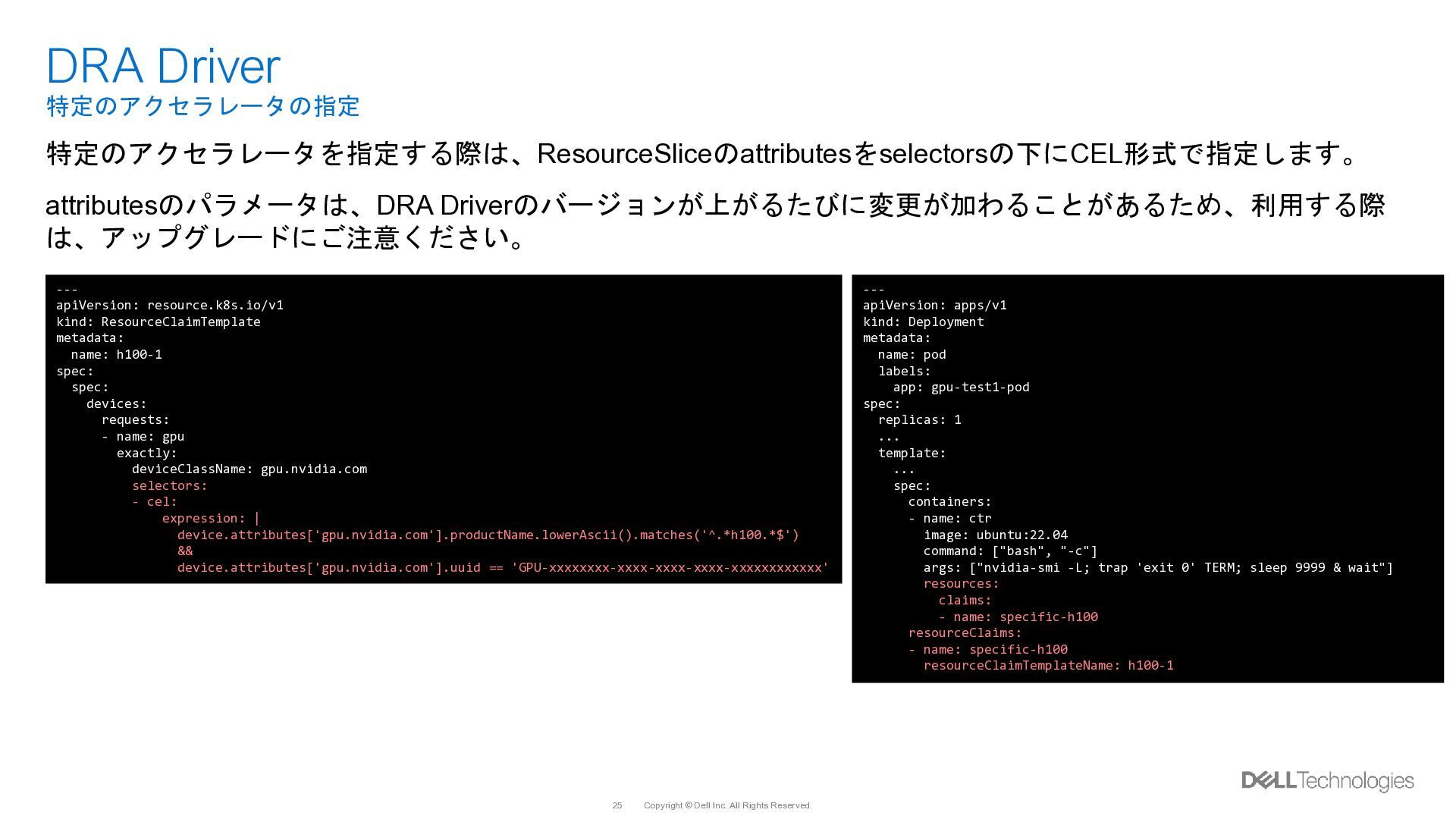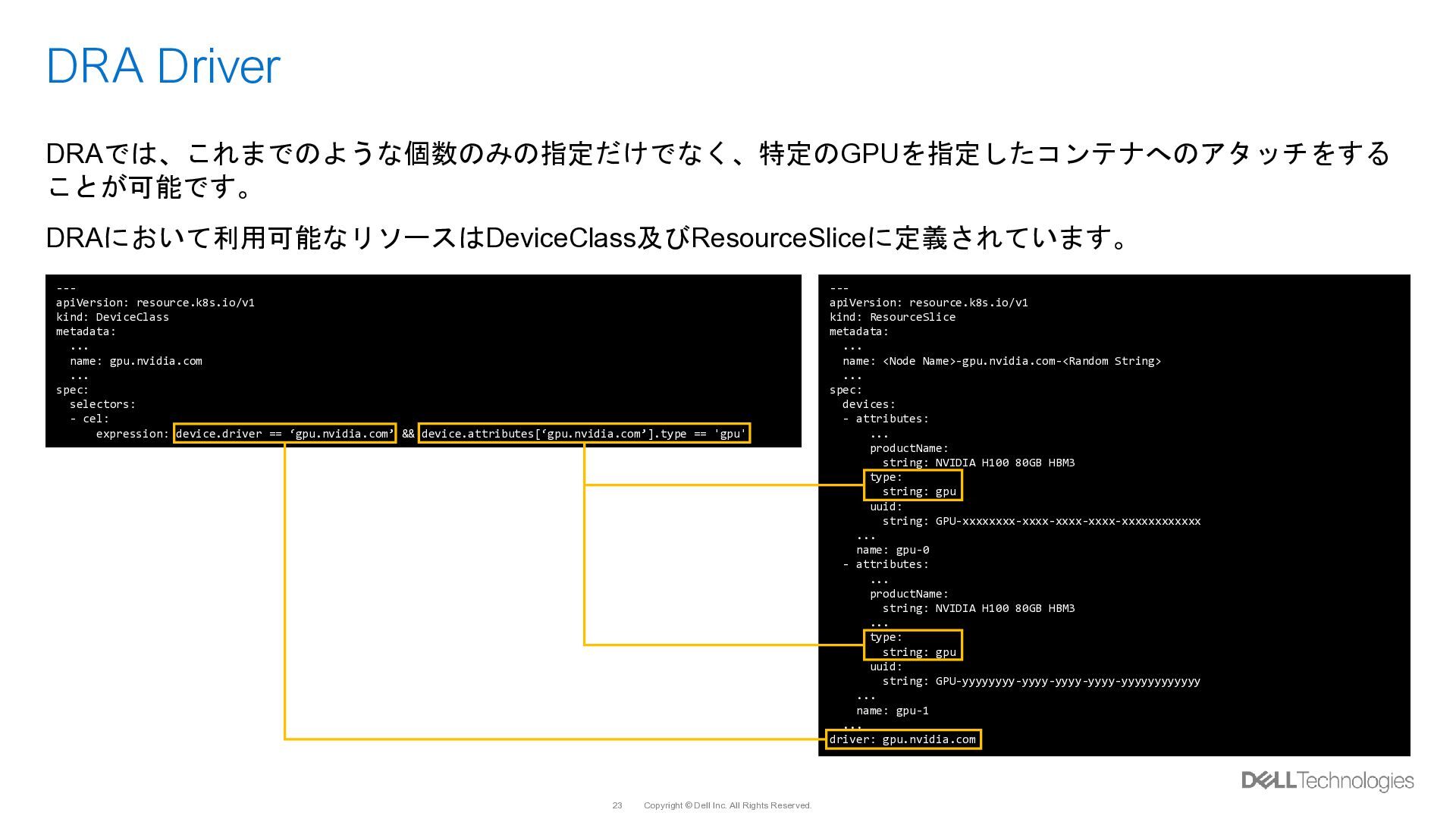 DRAでは、これまでのような個数のみの指定だけでなく、特定のGPUを指定したコンテナへのアタッチをする ことが可能です。 DRAにおいて利用可能なリソースはDeviceClass及びResourceSliceに定義されています。 --- apiVersion: resource.k8s.io/v1 kind: ResourceSlice metadata: ... name: <Node Name>-gpu.nvidia.com-<Random String> ... spec: devices: - attributes: ... productName: string: NVIDIA H100 80GB HBM3 type: string: gpu uuid: string: GPU-xxxxxxxx-xxxx-xxxx-xxxx-xxxxxxxxxxxx ... name: gpu-0 - attributes: ... productName: string: NVIDIA H100 80GB HBM3 ... type: string: gpu uuid: string: GPU-yyyyyyyy-yyyy-yyyy-yyyy-yyyyyyyyyyyy ... name: gpu-1 ... driver: gpu.nvidia.com --- apiVersion: resource.k8s.io/v1 kind: DeviceClass metadata: ... name: gpu.nvidia.com ... spec: selectors: - cel: expression: device.driver == ‘gpu.nvidia.com’ && device.attributes[‘gpu.nvidia.com’].type == 'gpu'