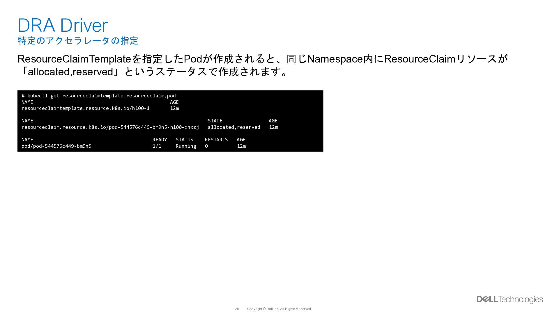 特定のアクセラレータの指定 ResourceClaimTemplateを指定したPodが作成されると、同じNamespace内にResourceClaimリソースが 「allocated,reserved」というステータスで作成されます。 # kubectl get resourceclaimtemplate,resourceclaim,pod NAME AGE resourceclaimtemplate.resource.k8s.io/h100-1 12m NAME STATE AGE resourceclaim.resource.k8s.io/pod-544576c449-bm9n5-h100-xhxzj allocated,reserved 12m NAME READY STATUS RESTARTS AGE pod/pod-544576c449-bm9n5 1/1 Running 0 12m