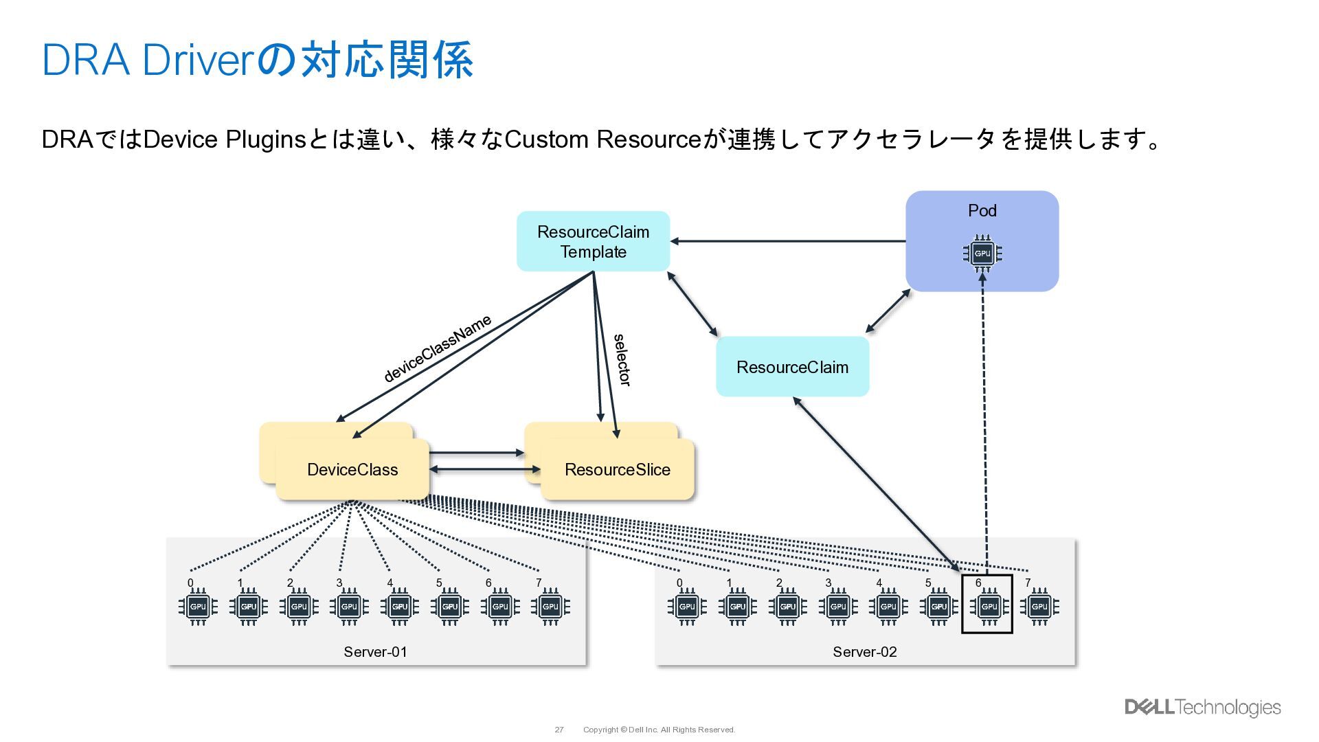 DRAではDevice Pluginsとは違い、様々なCustom Resourceが連携してアクセラレータを提供します。 Server-01 0 1 2 3 4 5 6 7 Server-02 0 1 2 3 4 5 6 7 DeviceClass ResourceSlice DeviceClass ResourceClaim Template Pod ResourceClaim ResourceSlice