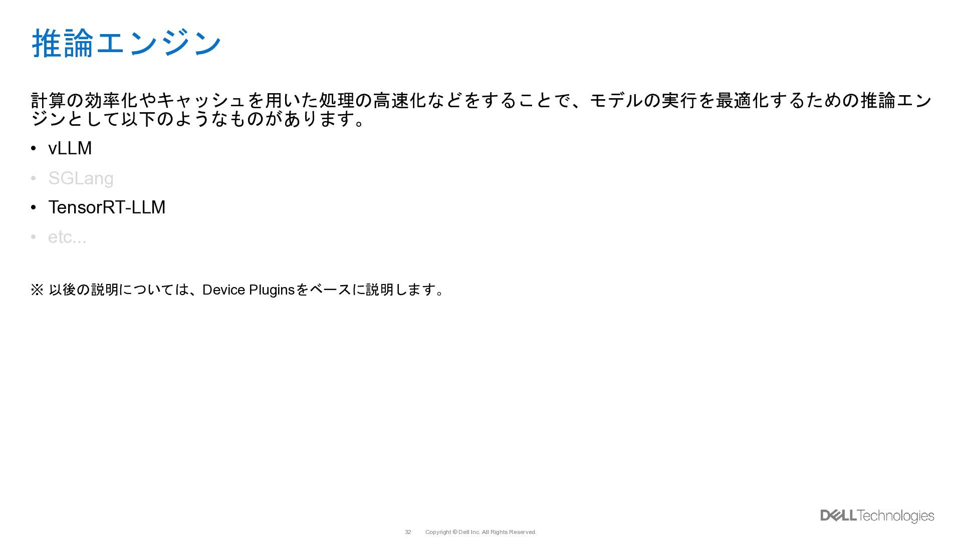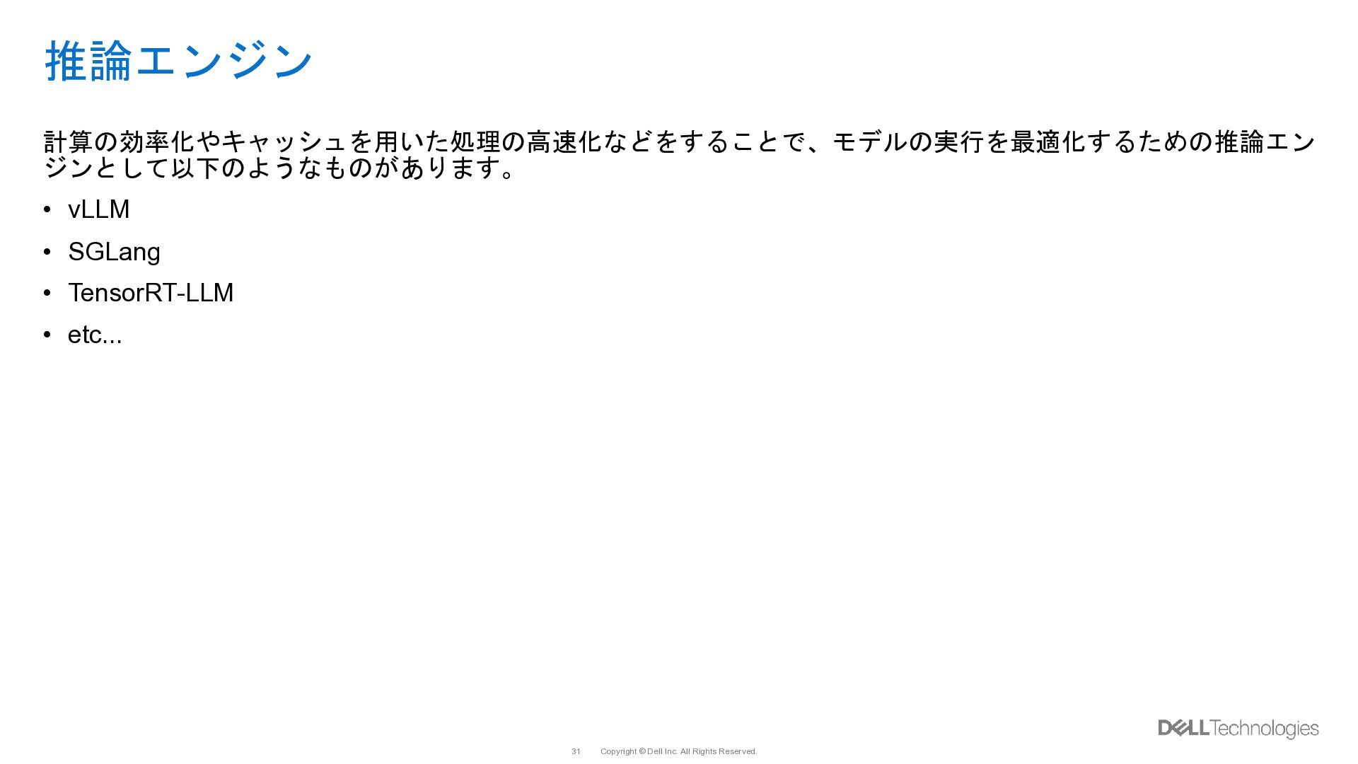 26. Copyright © Dell Inc. All Rights Reserved. 32 推論エンジン 計算の効率化やキャッシュを用いた処理の高速化などをすることで、モデルの実行を最適化するための推論エン
