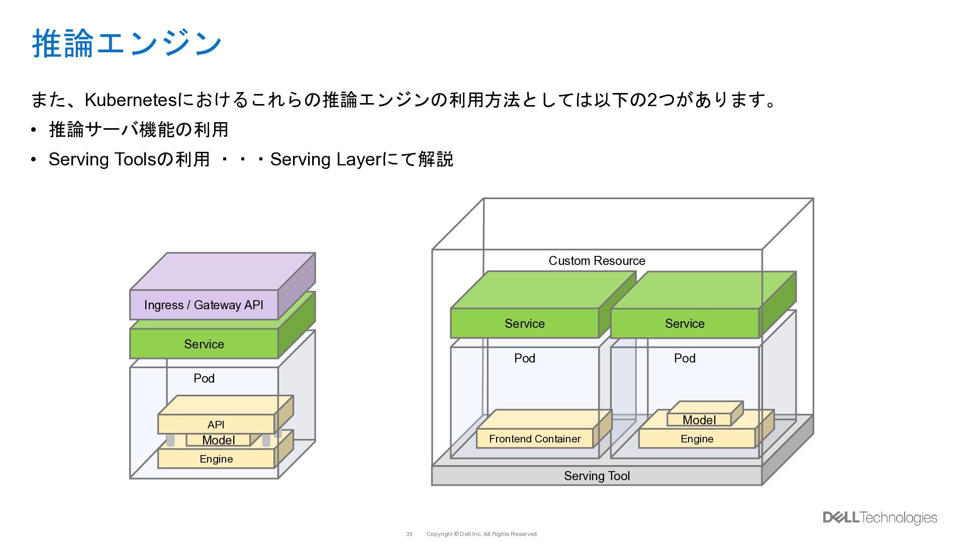 Custom Resource Pod Service 推論エンジン また、Kubernetesにおけるこれらの推論エンジンの利用方法としては以下の2つがあります。 • 推論サーバ機能の利用 • Serving Toolsの利用 ・・・Serving Layerにて解説 Pod Engine Model API Service Ingress / Gateway API Pod Engine Model Service Frontend Container