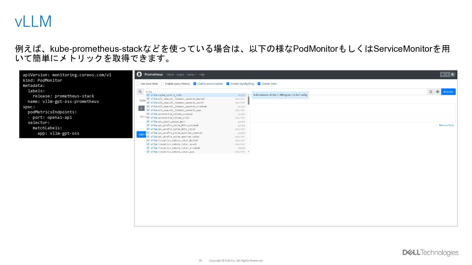 30. Copyright © Dell Inc. All Rights Reserved. 36 vLLM 例えば、kube-prometheus-stackなどを使っている場合は、以下の様なPodMonitorもしくはServiceMonitorを用