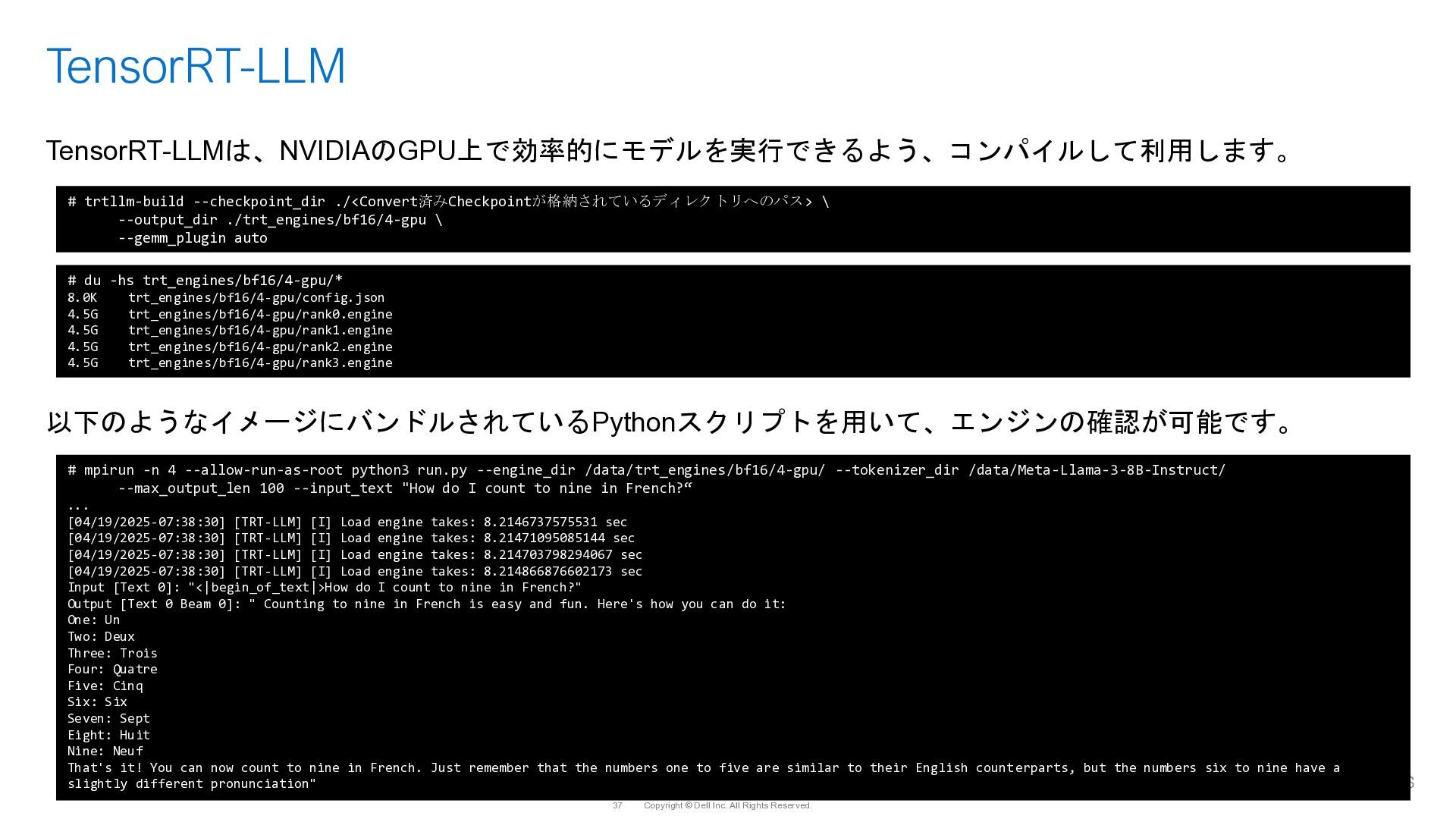 31. Copyright © Dell Inc. All Rights Reserved. 37 TensorRT-LLM TensorRT-LLMは、NVIDIAのGPU上で効率的にモデルを実行できるよう、コンパイルして利用します。