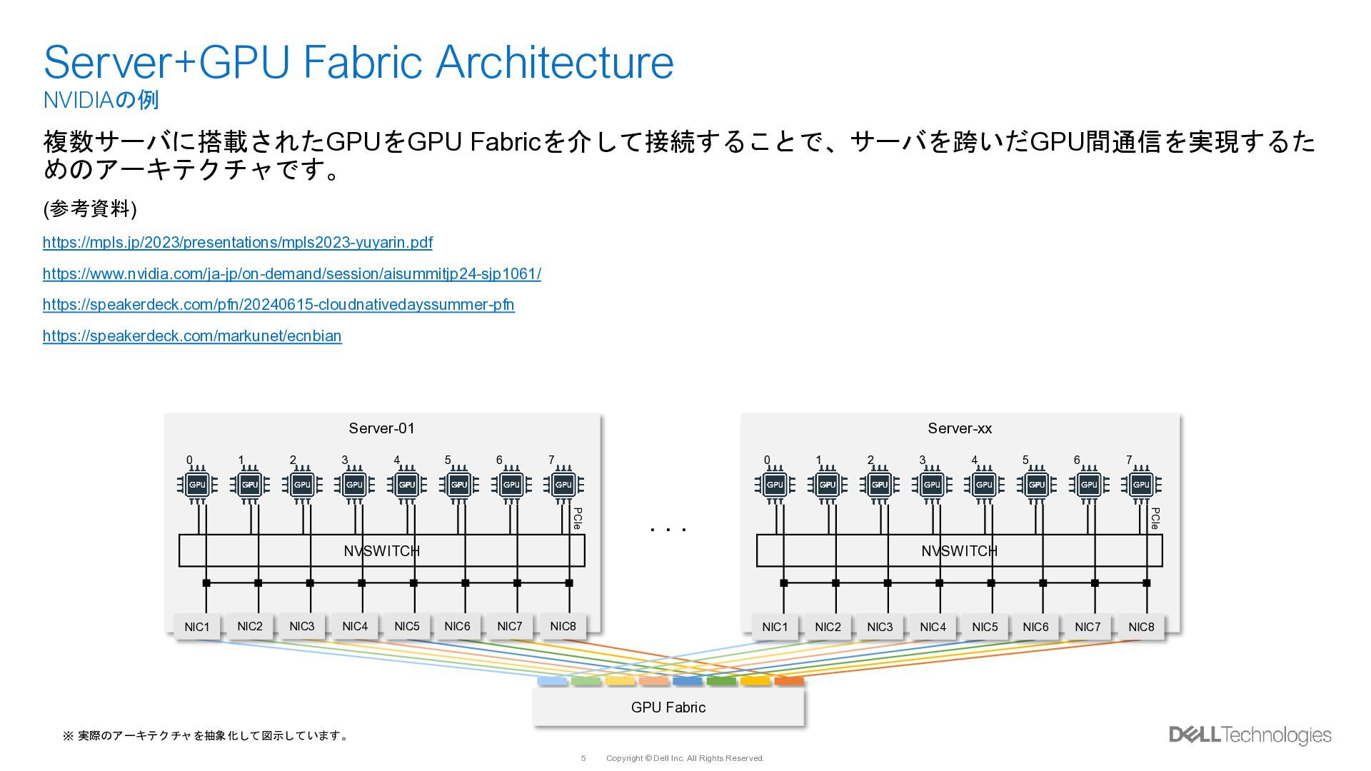 Architecture NVIDIAの例 Server-01 GPU Fabric NVSWITCH PCIe Server-xx NVSWITCH PCIe NIC1 NIC2 NIC3 NIC4 NIC5 NIC6 NIC7 NIC8 NIC1 NIC2 NIC3 NIC4 NIC5 NIC6 NIC7 NIC8 0 1 2 3 4 5 6 7 0 1 2 3 4 5 6 7 ※ 実際のアーキテクチャを抽象化して図示しています。 ・・・ 複数サーバに搭載されたGPUをGPU Fabricを介して接続することで、サーバを跨いだGPU間通信を実現するた めのアーキテクチャです。 (参考資料) https://mpls.jp/2023/presentations/mpls2023-yuyarin.pdf https://www.nvidia.com/ja-jp/on-demand/session/aisummitjp24-sjp1061/ https://speakerdeck.com/pfn/20240615-cloudnativedayssummer-pfn https://speakerdeck.com/markunet/ecnbian