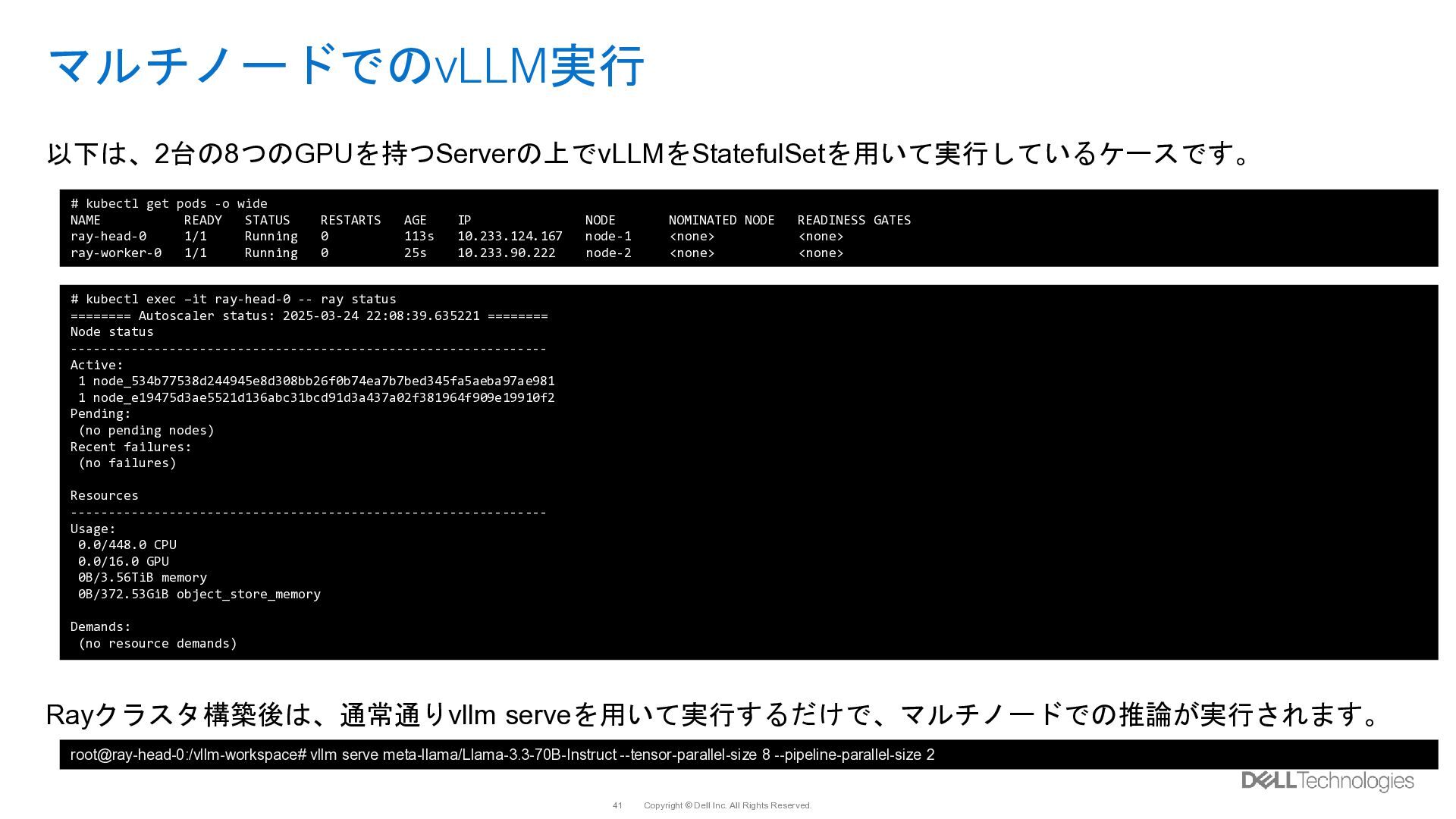 34. Copyright © Dell Inc. All Rights Reserved. 41 マルチノードでのvLLM実行 以下は、2台の8つのGPUを持つServerの上でvLLMをStatefulSetを用いて実行しているケースです。