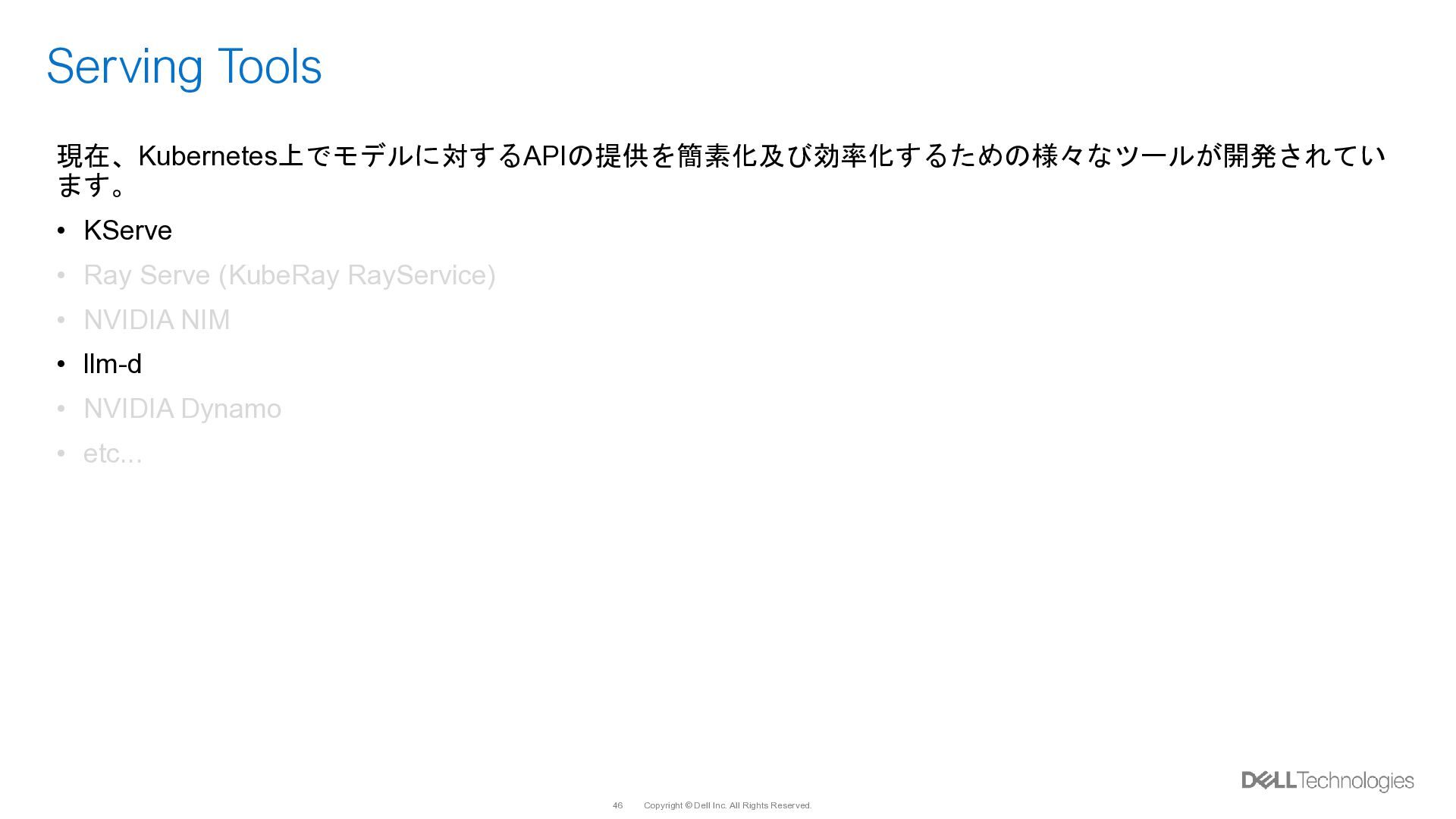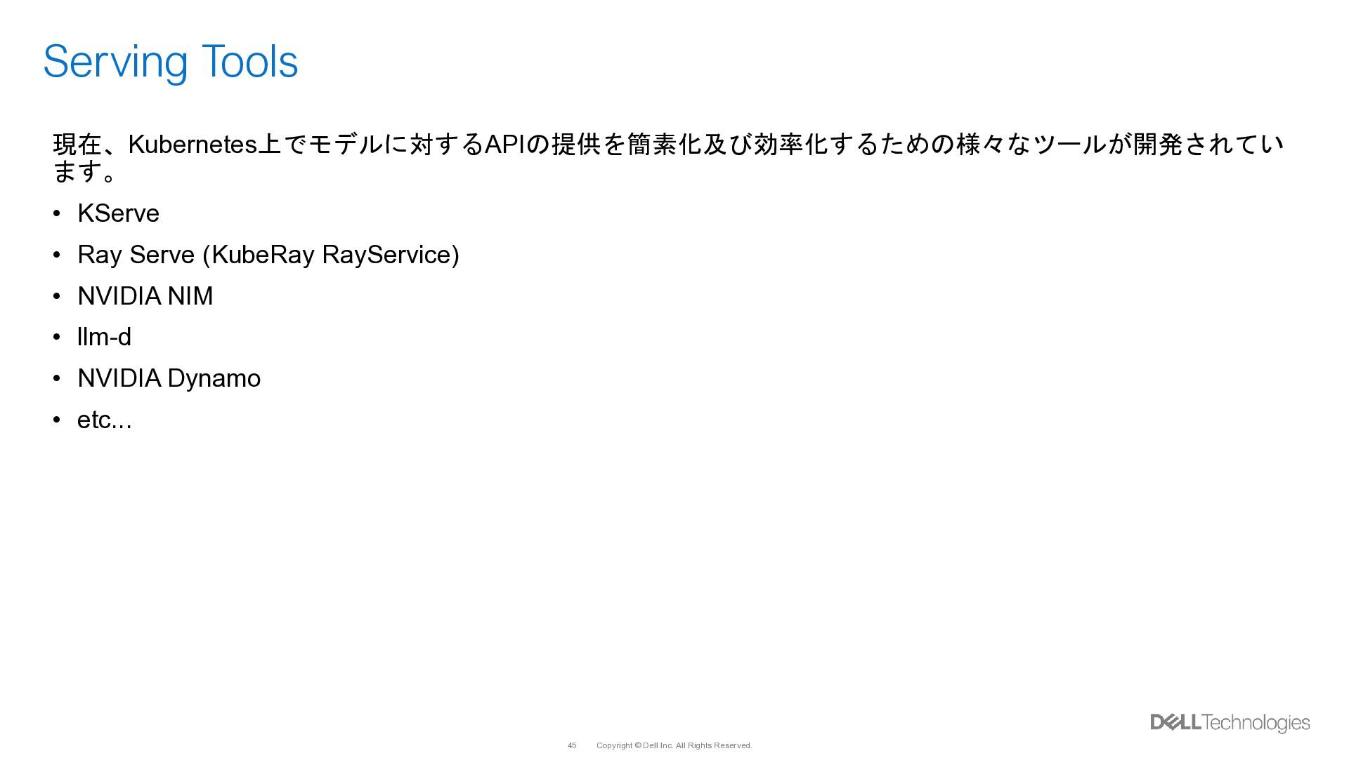 現在、Kubernetes上でモデルに対するAPIの提供を簡素化及び効率化するための様々なツールが開発されてい ます。 • KServe • Ray Serve (KubeRay RayService) • NVIDIA NIM • llm-d • NVIDIA Dynamo • etc...