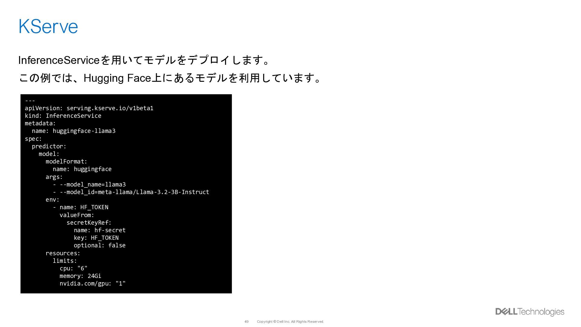 40. Copyright © Dell Inc. All Rights Reserved. 49 KServe InferenceServiceを用いてモデルをデプロイします。