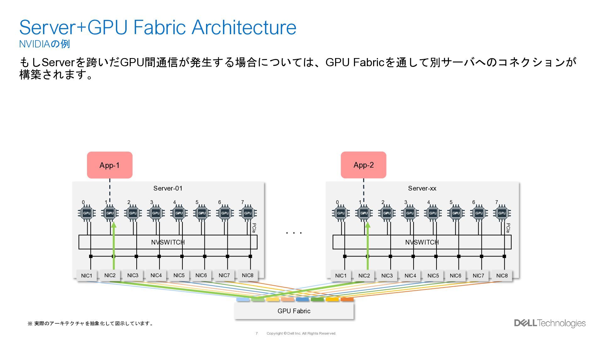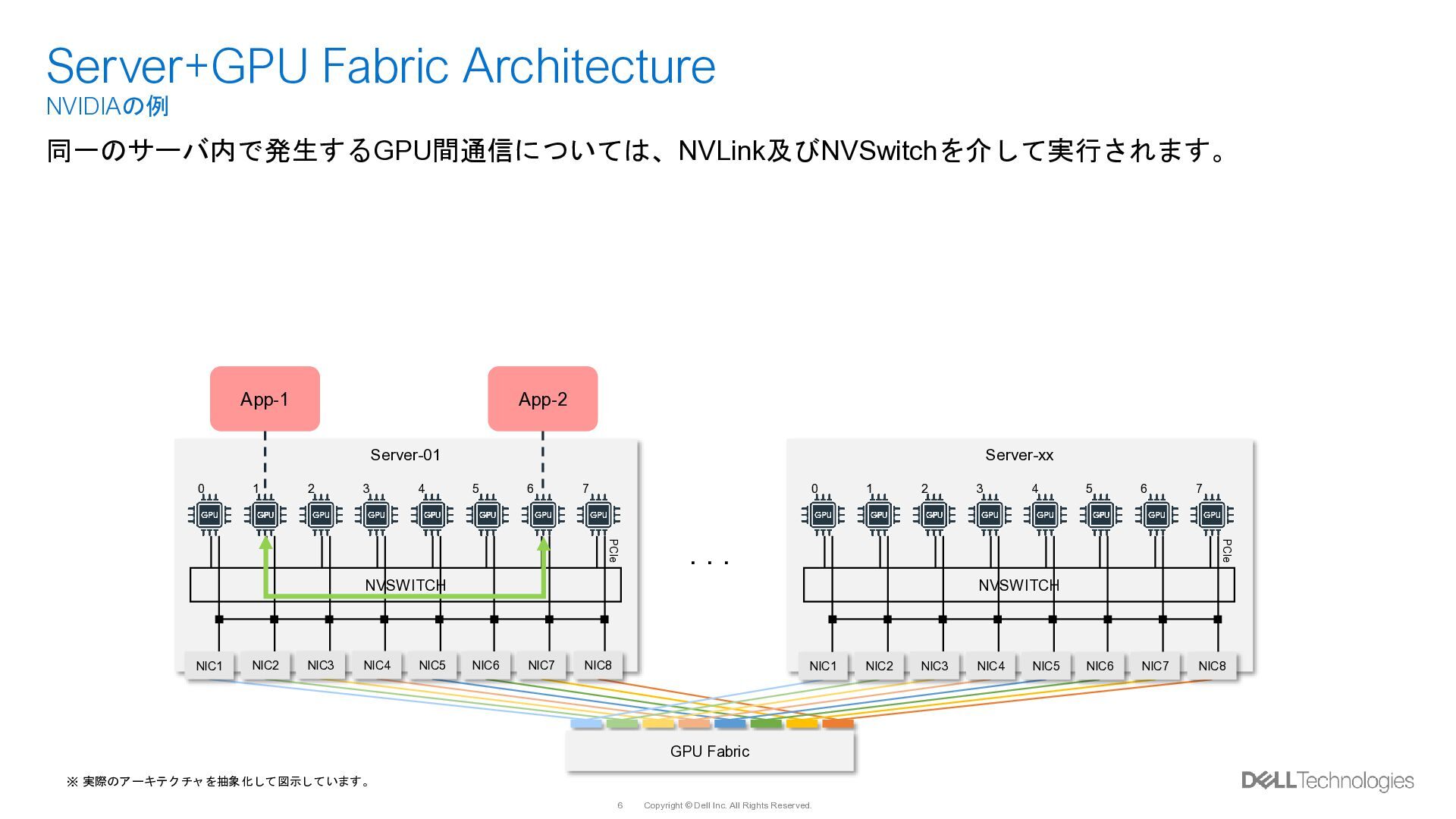 Architecture NVIDIAの例 Server-01 GPU Fabric NVSWITCH PCIe Server-xx NVSWITCH PCIe 0 1 2 3 4 5 6 7 0 1 2 3 4 5 6 7 ※ 実際のアーキテクチャを抽象化して図示しています。 ・・・ 同一のサーバ内で発生するGPU間通信については、NVLink及びNVSwitchを介して実行されます。 App-1 App-2 NIC1 NIC2 NIC3 NIC4 NIC5 NIC6 NIC7 NIC8 NIC1 NIC2 NIC3 NIC4 NIC5 NIC6 NIC7 NIC8