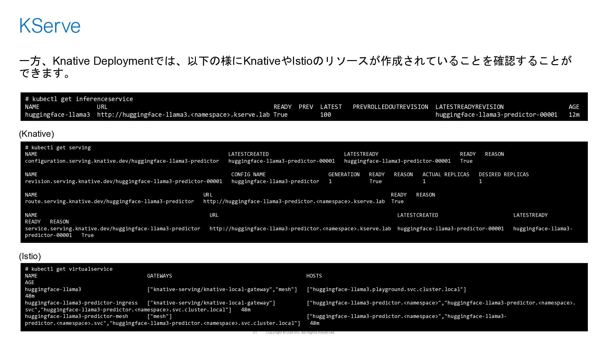 Deploymentでは、以下の様にKnativeやIstioのリソースが作成されていることを確認することが できます。 (Knative) (Istio) # kubectl get inferenceservice NAME URL READY PREV LATEST PREVROLLEDOUTREVISION LATESTREADYREVISION AGE huggingface-llama3 http://huggingface-llama3.<namespace>.kserve.lab True 100 huggingface-llama3-predictor-00001 12m # kubectl get serving NAME LATESTCREATED LATESTREADY READY REASON configuration.serving.knative.dev/huggingface-llama3-predictor huggingface-llama3-predictor-00001 huggingface-llama3-predictor-00001 True NAME CONFIG NAME GENERATION READY REASON ACTUAL REPLICAS DESIRED REPLICAS revision.serving.knative.dev/huggingface-llama3-predictor-00001 huggingface-llama3-predictor 1 True 1 1 NAME URL READY REASON route.serving.knative.dev/huggingface-llama3-predictor http://huggingface-llama3-predictor.<namespace>.kserve.lab True NAME URL LATESTCREATED LATESTREADY READY REASON service.serving.knative.dev/huggingface-llama3-predictor http://huggingface-llama3-predictor.<namespace>.kserve.lab huggingface-llama3-predictor-00001 huggingface-llama3- predictor-00001 True # kubectl get virtualservice NAME GATEWAYS HOSTS AGE huggingface-llama3 ["knative-serving/knative-local-gateway","mesh"] ["huggingface-llama3.playground.svc.cluster.local"] 48m huggingface-llama3-predictor-ingress ["knative-serving/knative-local-gateway"] ["huggingface-llama3-predictor.<namespace>","huggingface-llama3-predictor.<namespace>. svc","huggingface-llama3-predictor.<namespace>.svc.cluster.local"] 48m huggingface-llama3-predictor-mesh ["mesh"] ["huggingface-llama3-predictor.<namespace>","huggingface-llama3- predictor.<namespace>.svc","huggingface-llama3-predictor.<namespace>.svc.cluster.local"] 48m