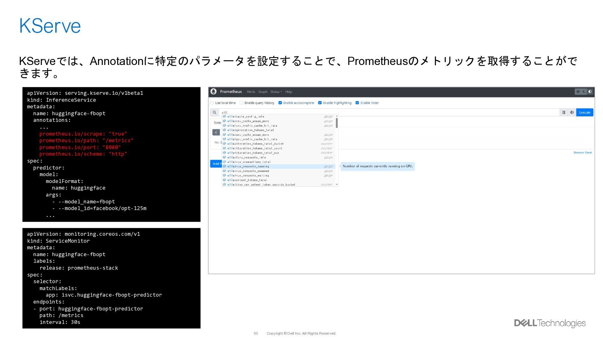 43. Copyright © Dell Inc. All Rights Reserved. 53 KServe KServeでは、Annotationに特定のパラメータを設定することで、Prometheusのメトリックを取得することがで