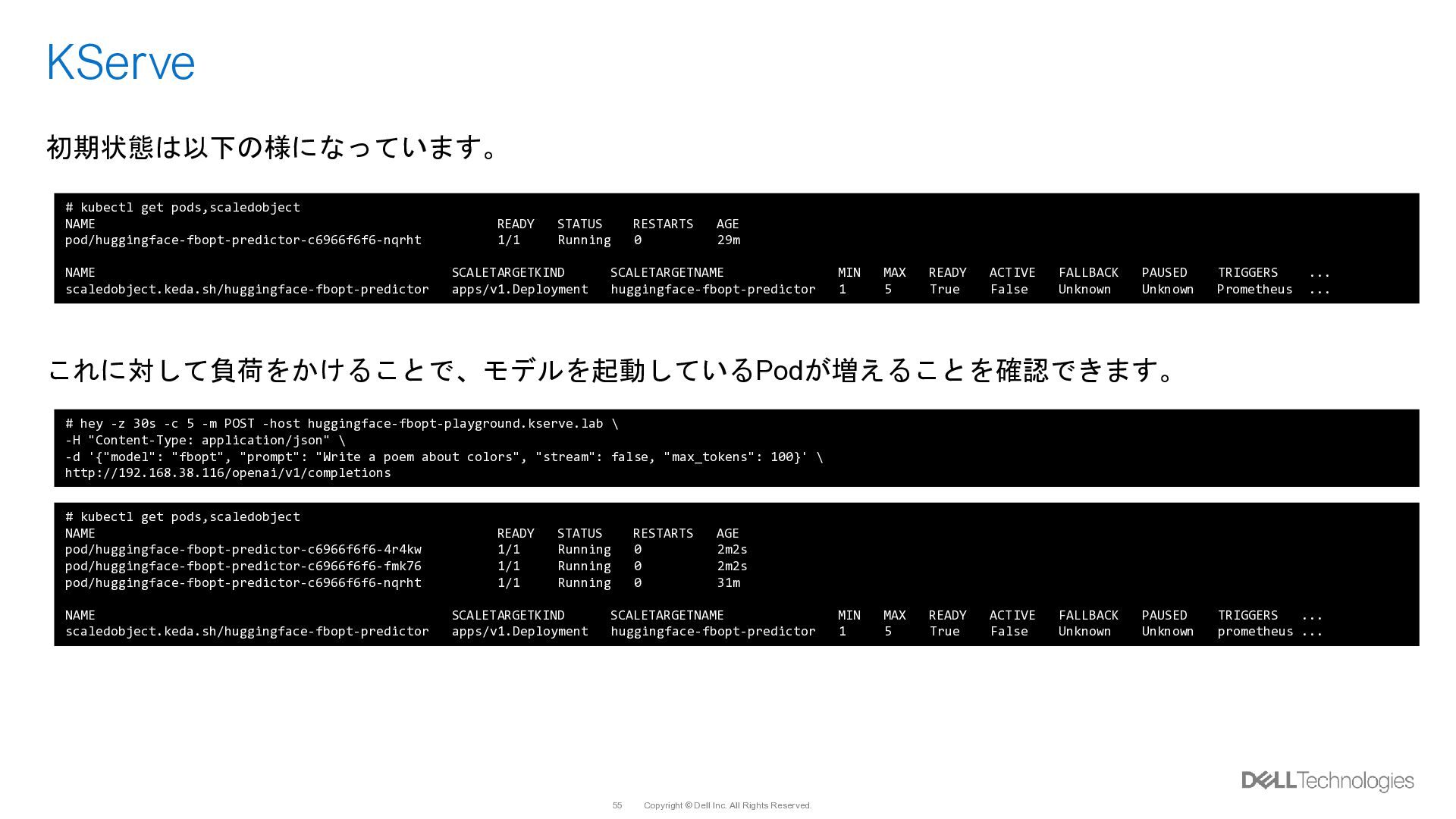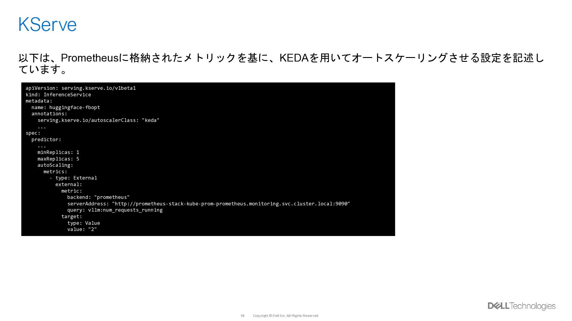 44. Copyright © Dell Inc. All Rights Reserved. 54 KServe 以下は、Prometheusに格納されたメトリックを基に、KEDAを用いてオートスケーリングさせる設定を記述し