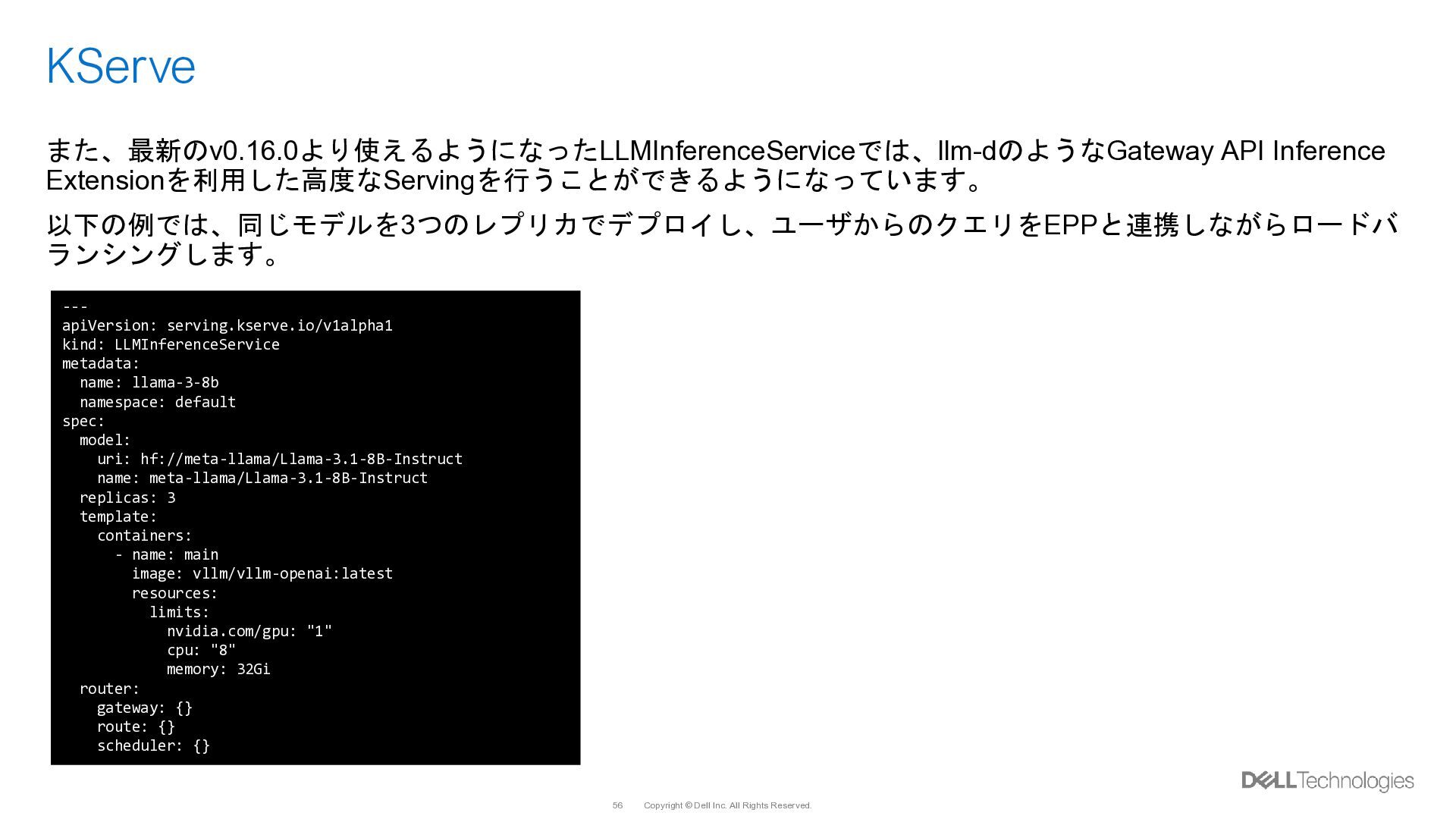 46. Copyright © Dell Inc. All Rights Reserved. 56 KServe また、最新のv0.16.0より使えるようになったLLMInferenceServiceでは、llm-dのようなGateway