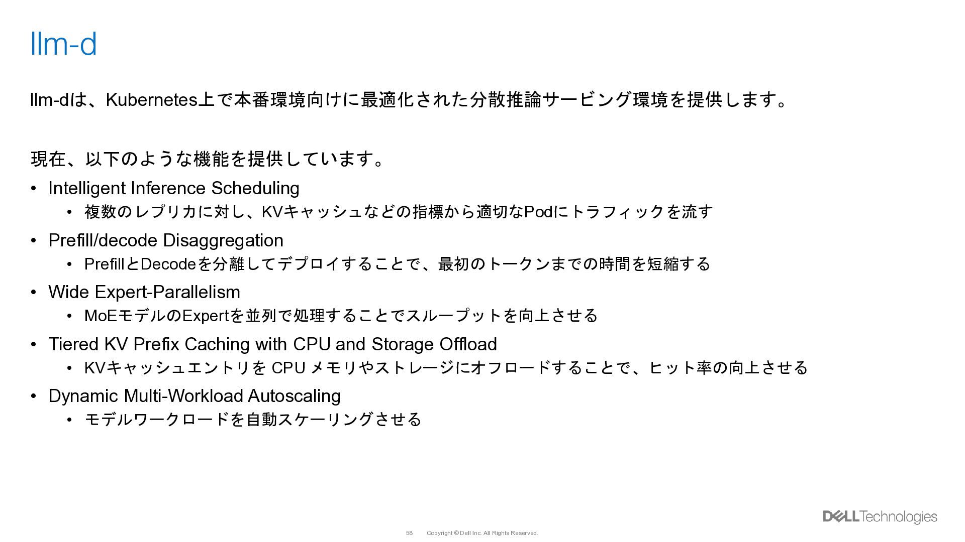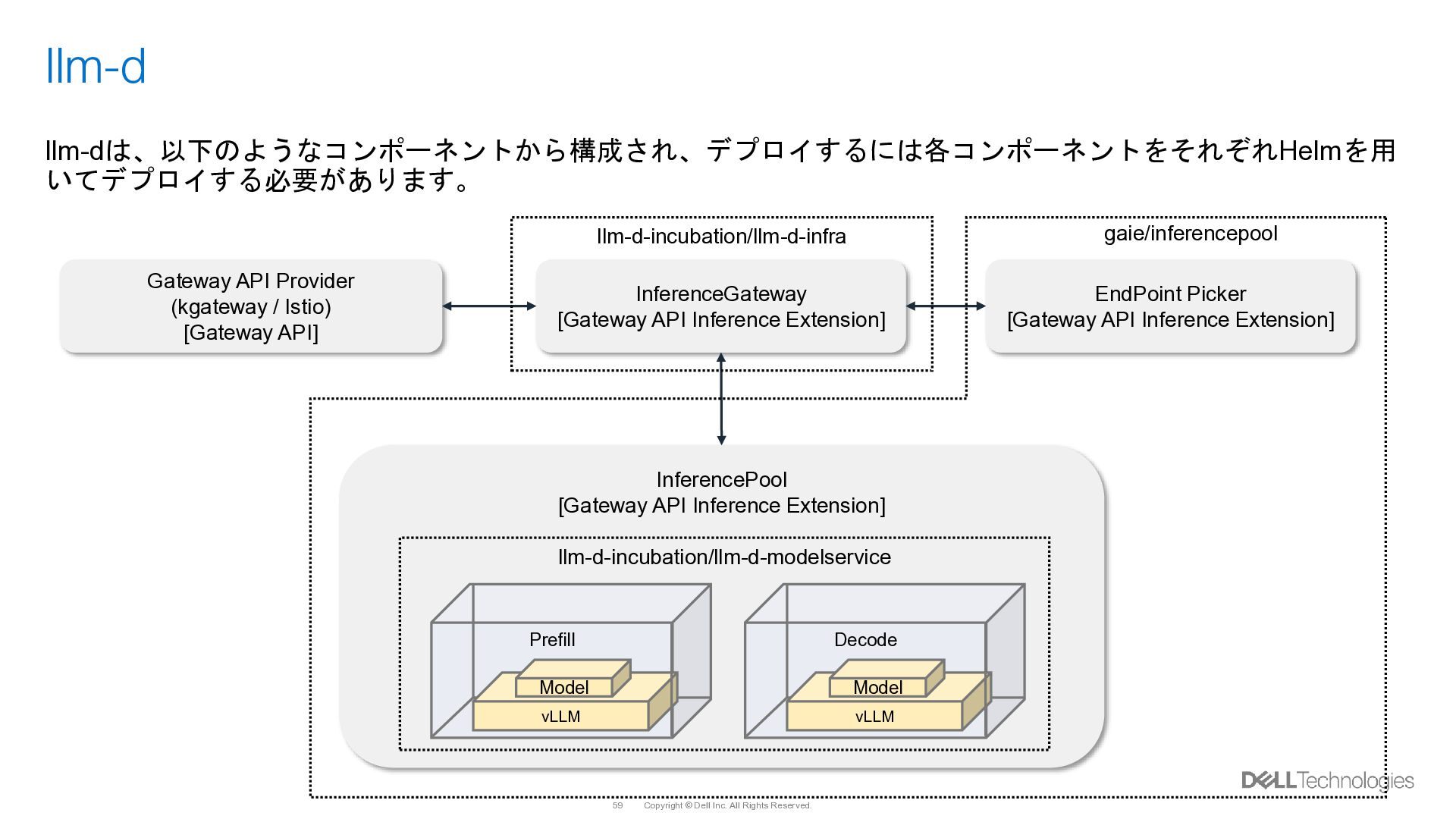 47. Copyright © Dell Inc. All Rights Reserved. 58 llm-d llm-dは、Kubernetes上で本番環境向けに最適化された分散推論サービング環境を提供します。