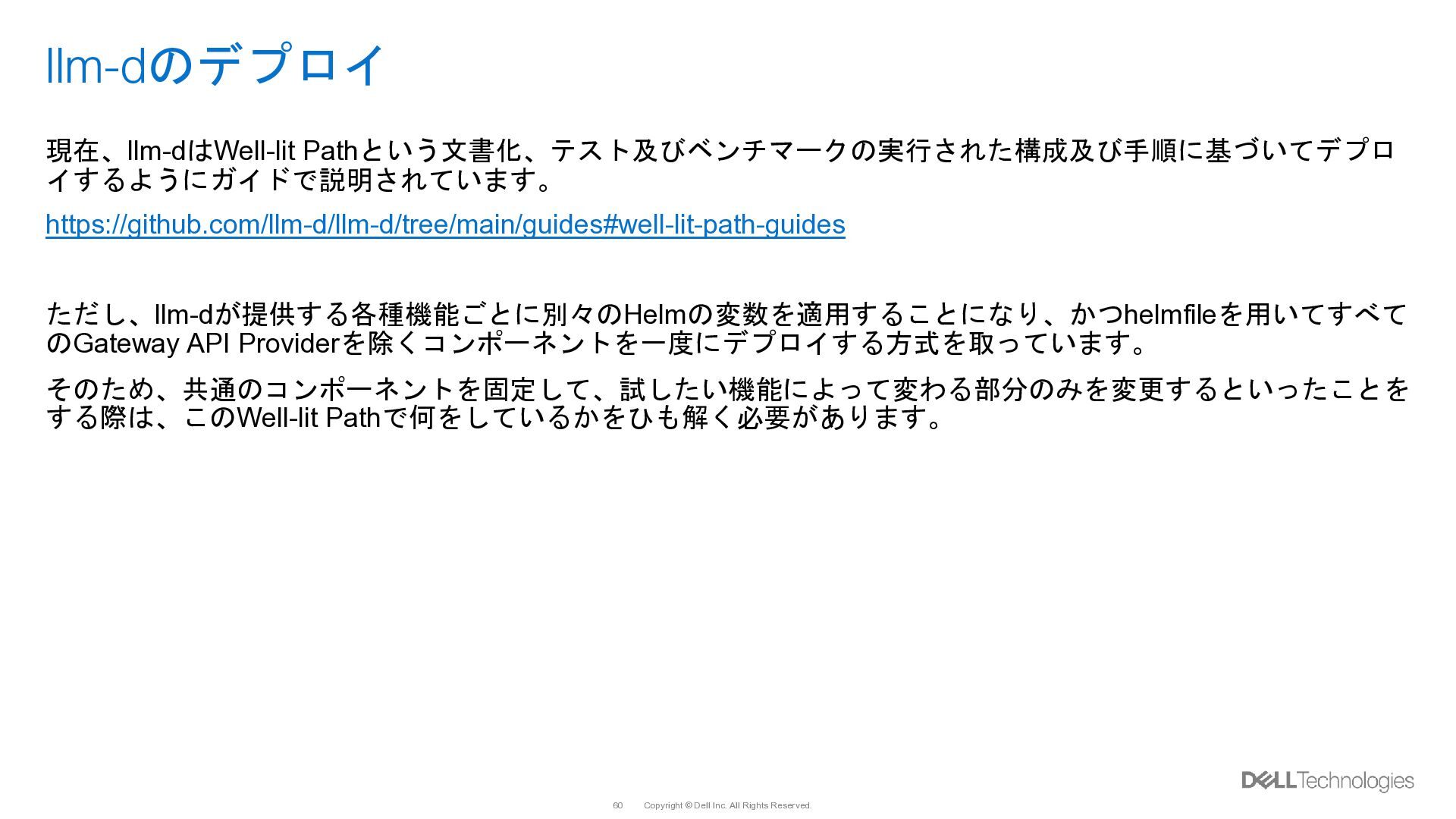 49. Copyright © Dell Inc. All Rights Reserved. 60 llm-dのデプロイ 現在、llm-dはWell-lit