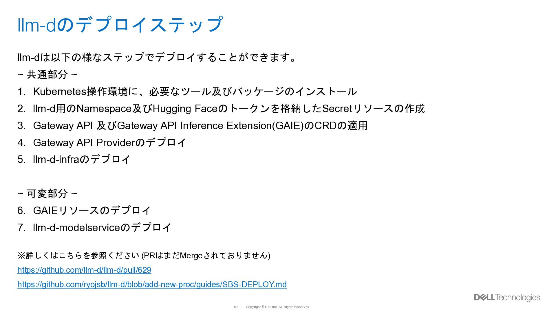 51. Copyright © Dell Inc. All Rights Reserved. 62 llm-dのデプロイステップ llm-dは以下の様なステップでデプロイすることができます。