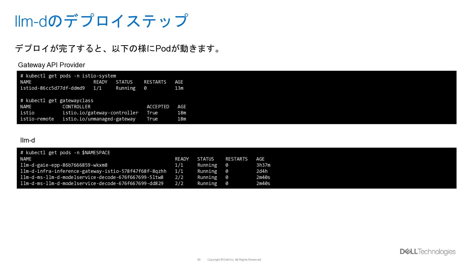 52. Copyright © Dell Inc. All Rights Reserved. 63 llm-dのデプロイステップ デプロイが完了すると、以下の様にPodが動きます。