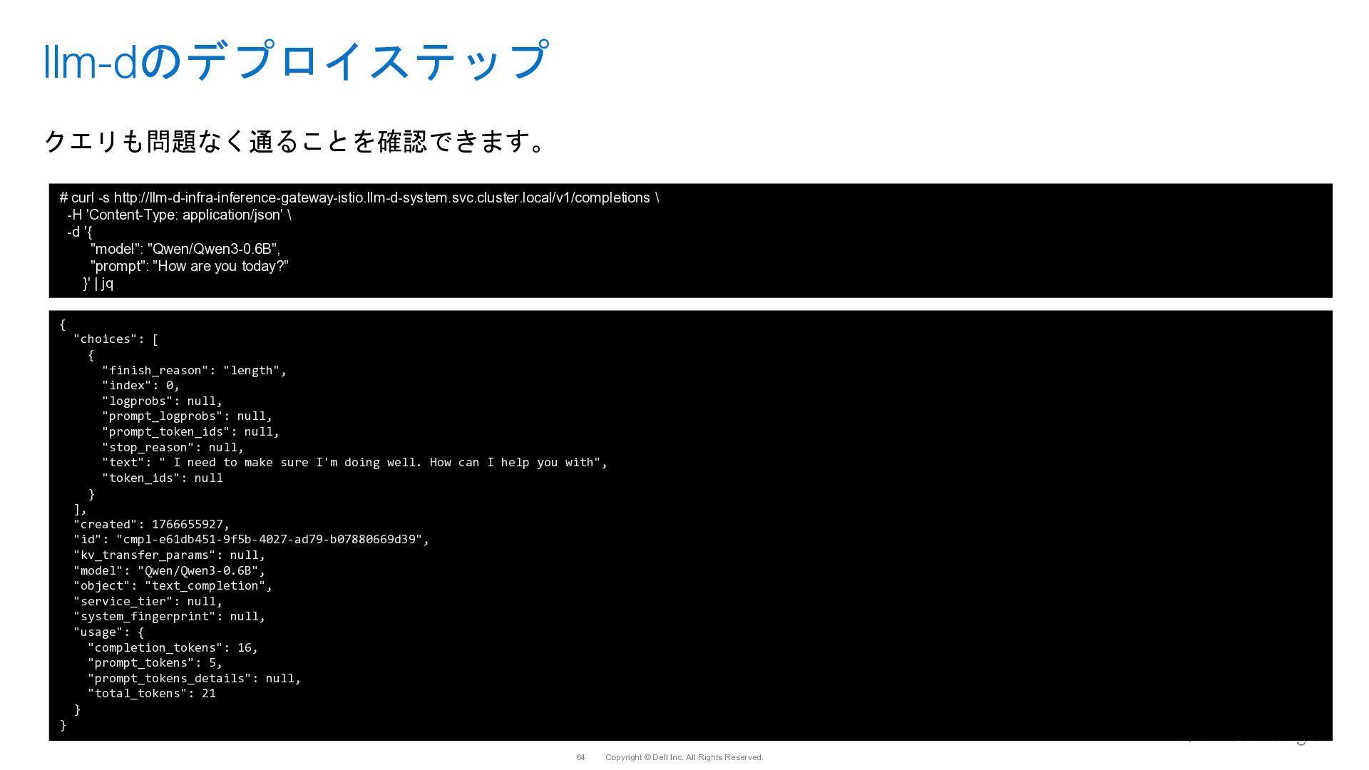 53. Copyright © Dell Inc. All Rights Reserved. 64 llm-dのデプロイステップ クエリも問題なく通ることを確認できます。