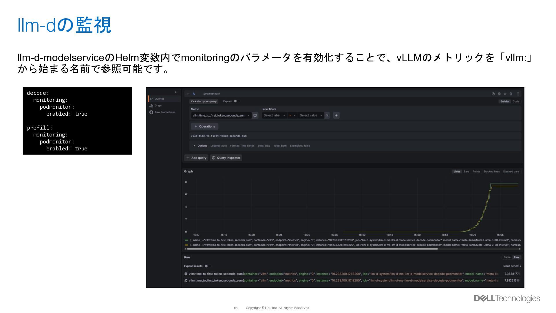 54. Copyright © Dell Inc. All Rights Reserved. 65 llm-dの監視 llm-d-modelserviceのHelm変数内でmonitoringのパラメータを有効化することで、vLLMのメトリックを「vllm:」