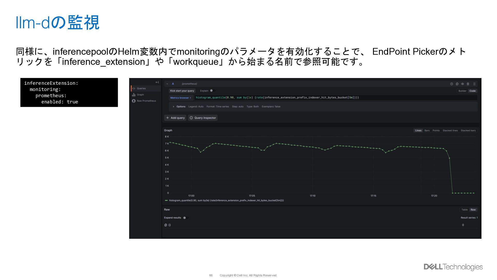 55. Copyright © Dell Inc. All Rights Reserved. 66 llm-dの監視 同様に、inferencepoolのHelm変数内でmonitoringのパラメータを有効化することで、