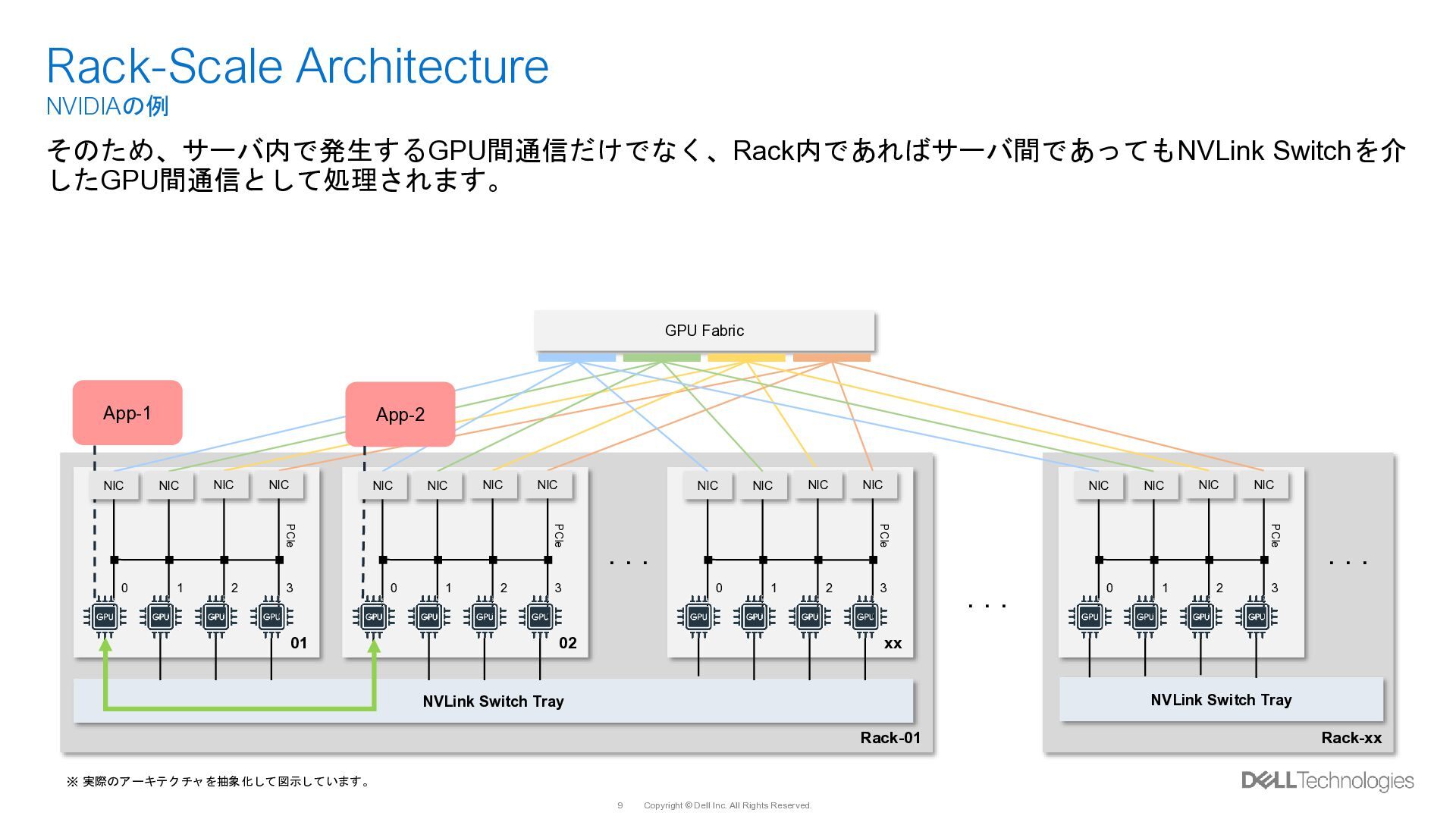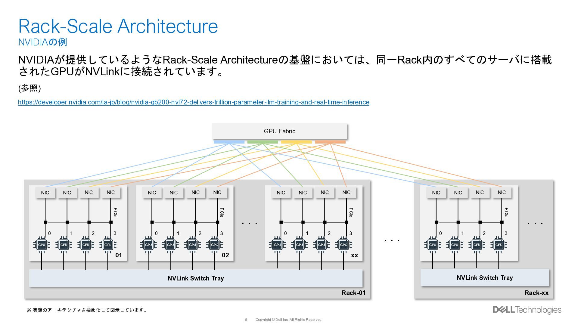 Architecture NVIDIAの例 01 GPU Fabric PCIe 0 1 2 3 02 PCIe 0 1 2 3 xx PCIe NIC 0 1 2 3 NIC NIC NIC Rack-xx PCIe NIC 0 1 2 3 NIC NIC NIC ・・・ ・・・ ・・・ NVLink Switch Tray NVLink Switch Tray ※ 実際のアーキテクチャを抽象化して図示しています。 そのため、サーバ内で発生するGPU間通信だけでなく、Rack内であればサーバ間であってもNVLink Switchを介 したGPU間通信として処理されます。 App-1 App-2 NIC NIC NIC NIC NIC NIC NIC NIC
