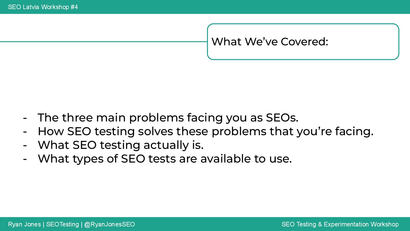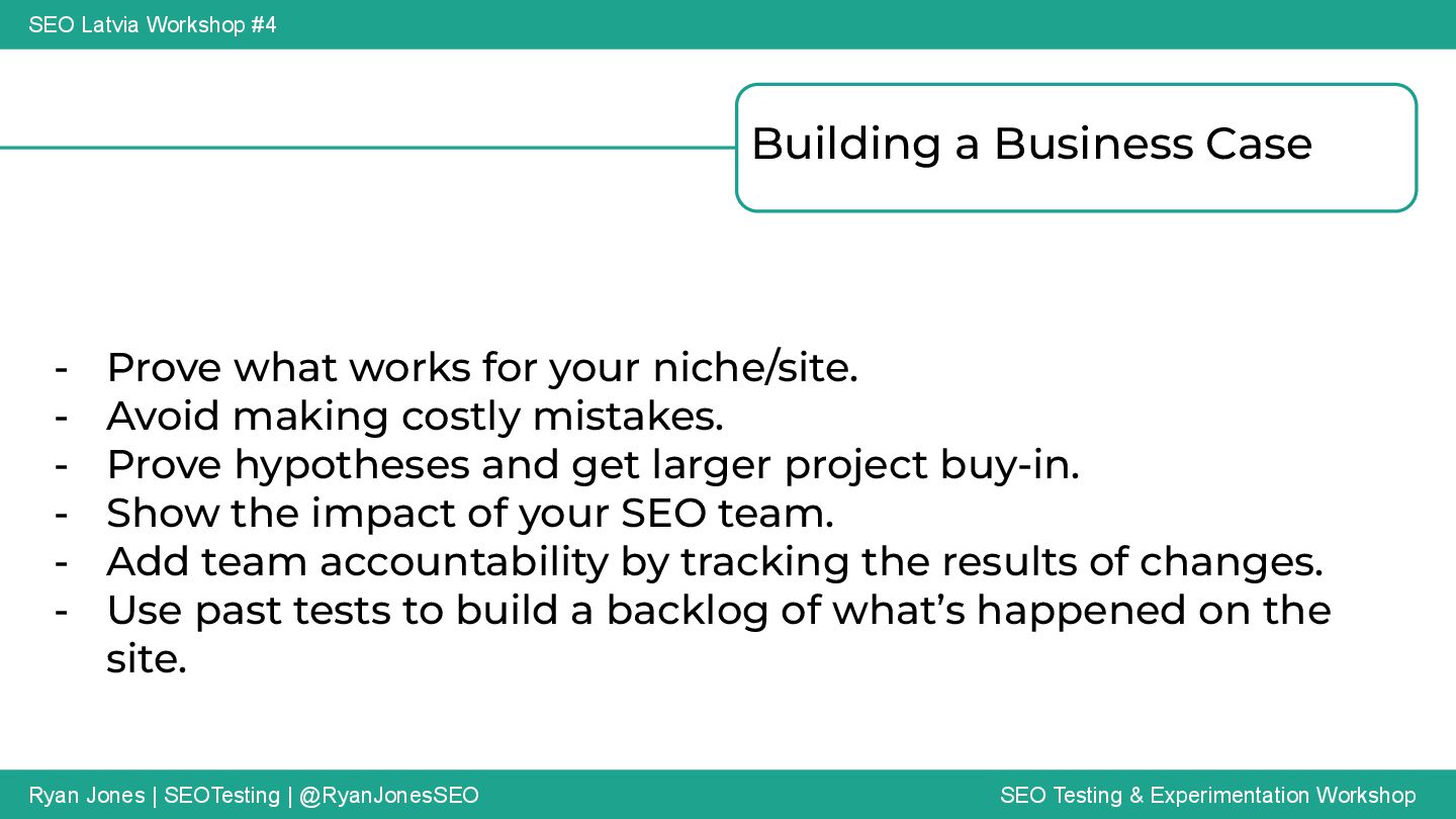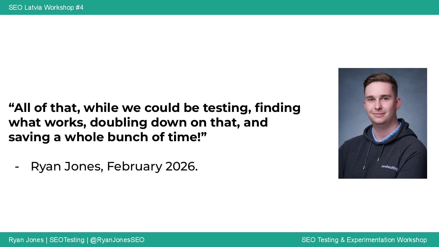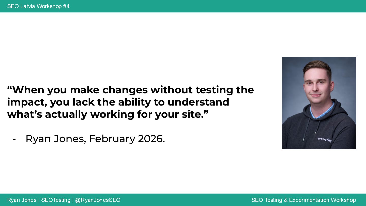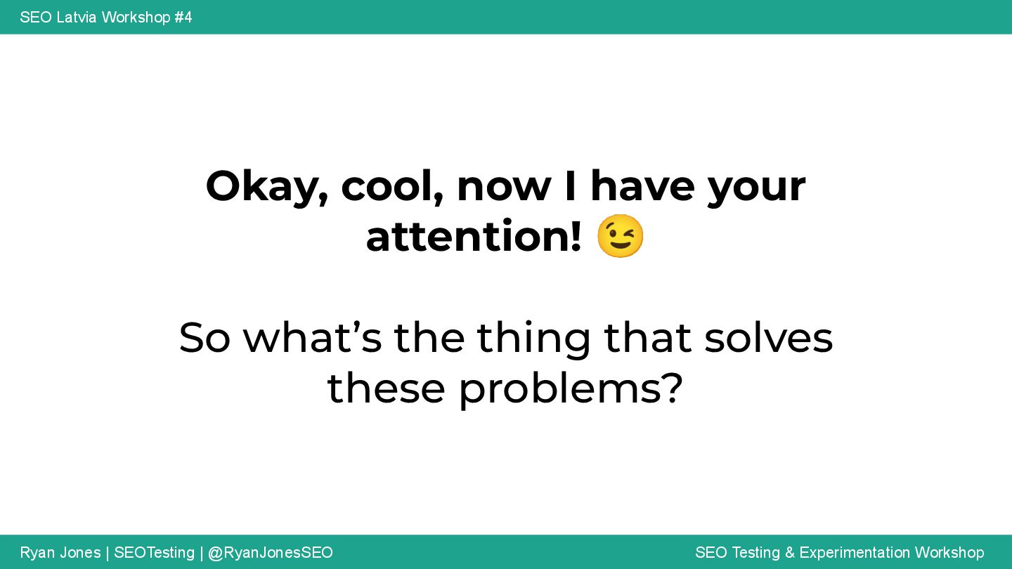 In this workshop from SEO Latvia Meetup #4, Ryan Jones (Marketing Manager at SEOTesting) walks through a complete SEO experimentation framework designed to help SEOs: