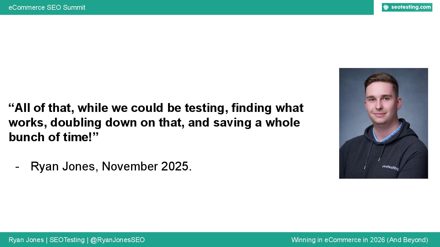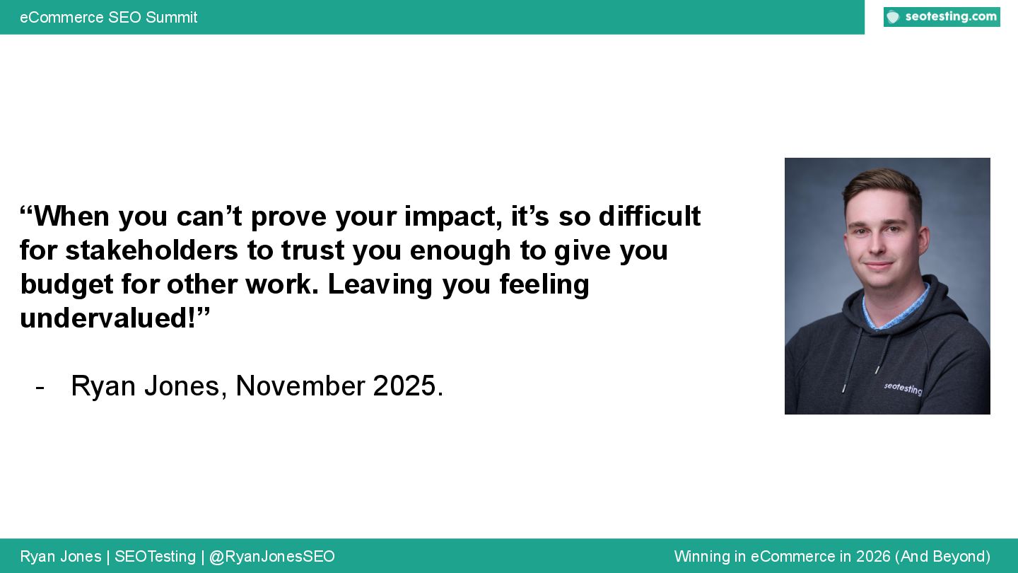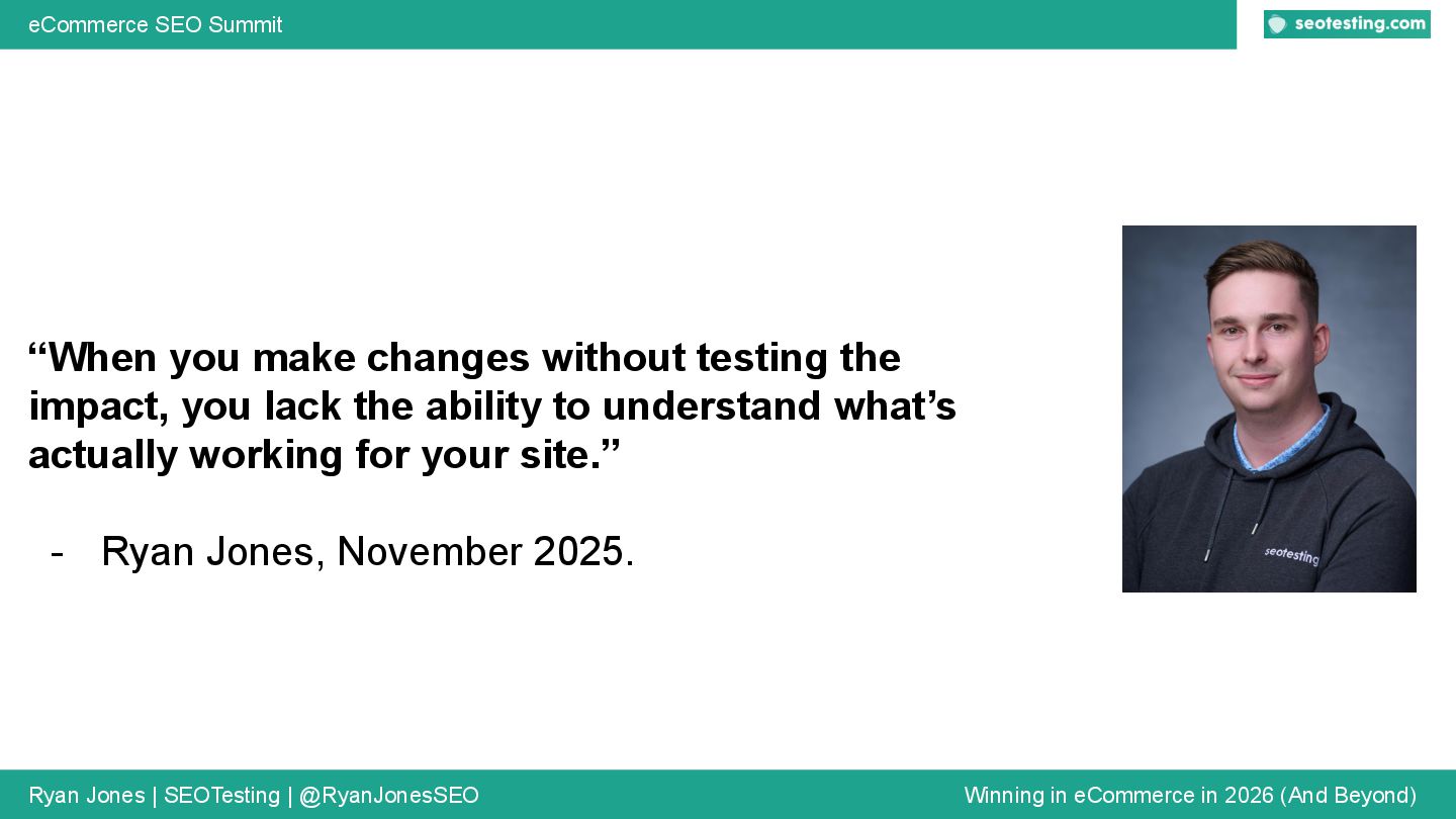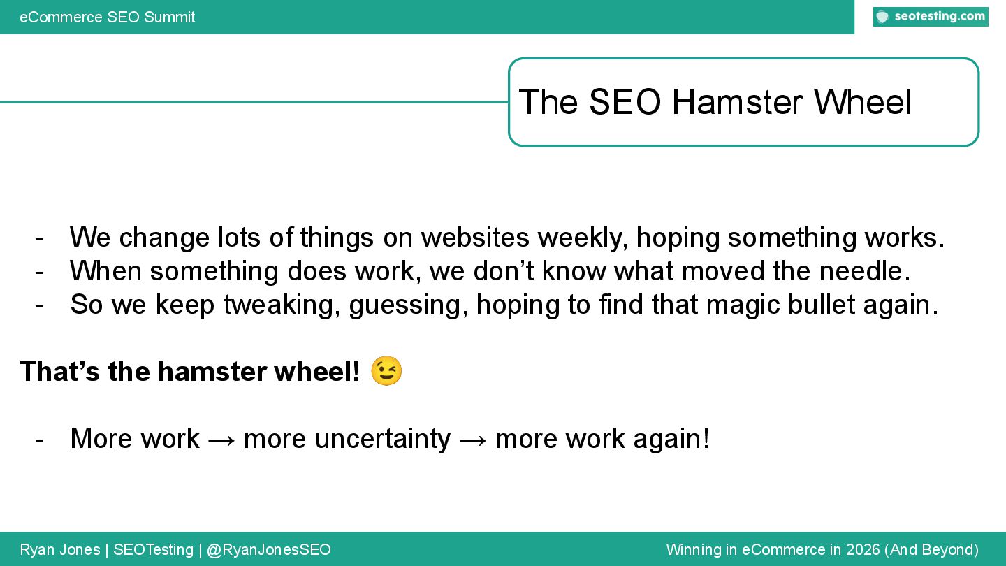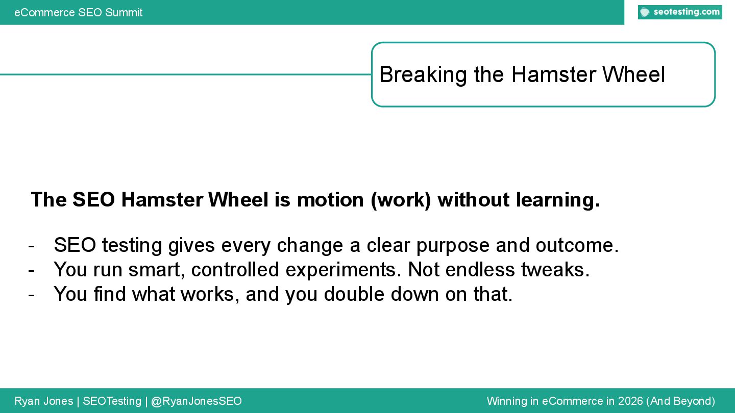 Most eCommerce teams are stuck on the SEO Hamster Wheel — constantly making changes, hoping something works, and struggling to prove what actually moved the needle. In this talk, Ryan Jones (SEOTesting) breaks down the three biggest challenges SEOs face today: lack of time, the “black box” of Google, and the constant pressure to justify impact to stakeholders.
