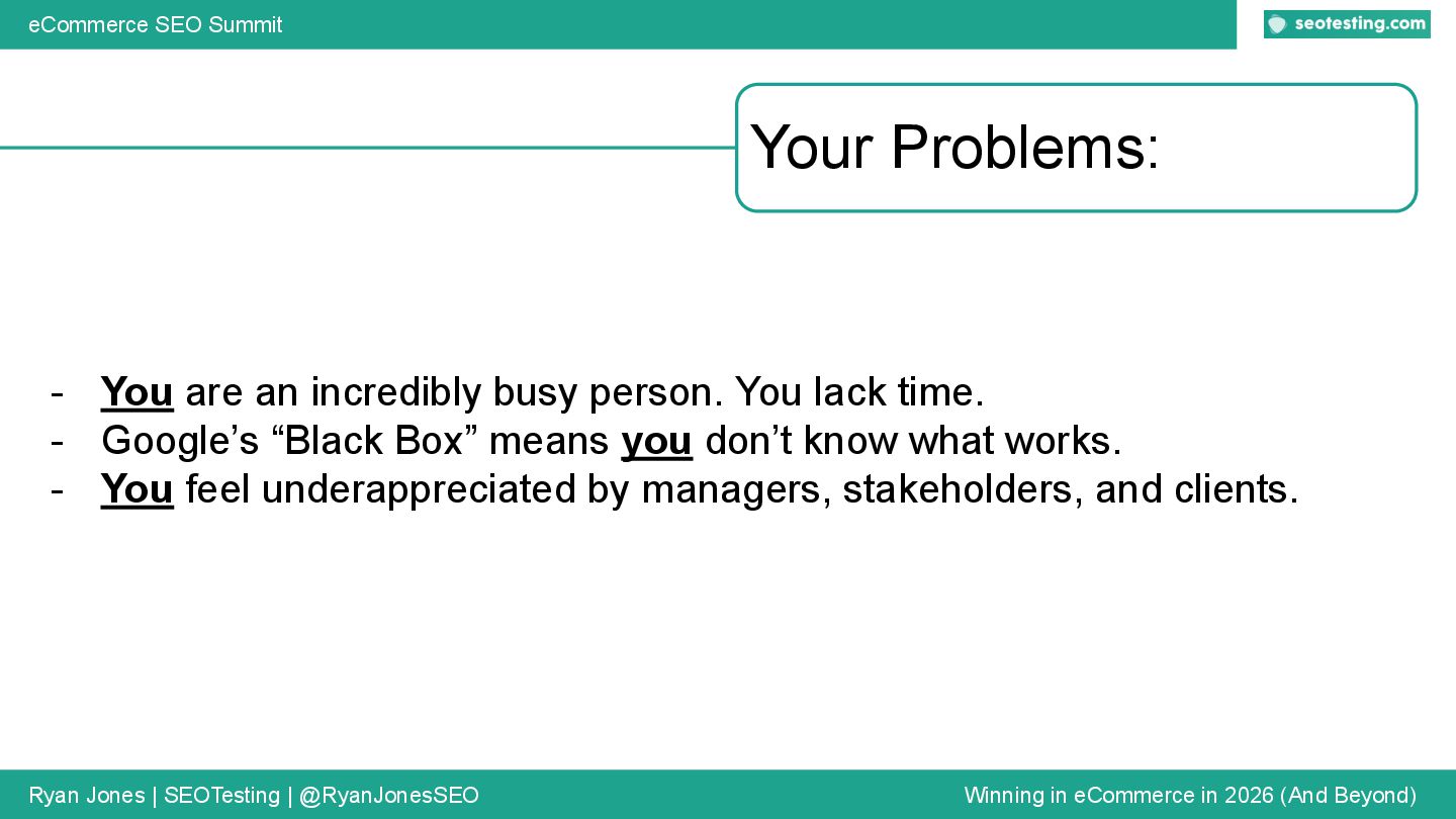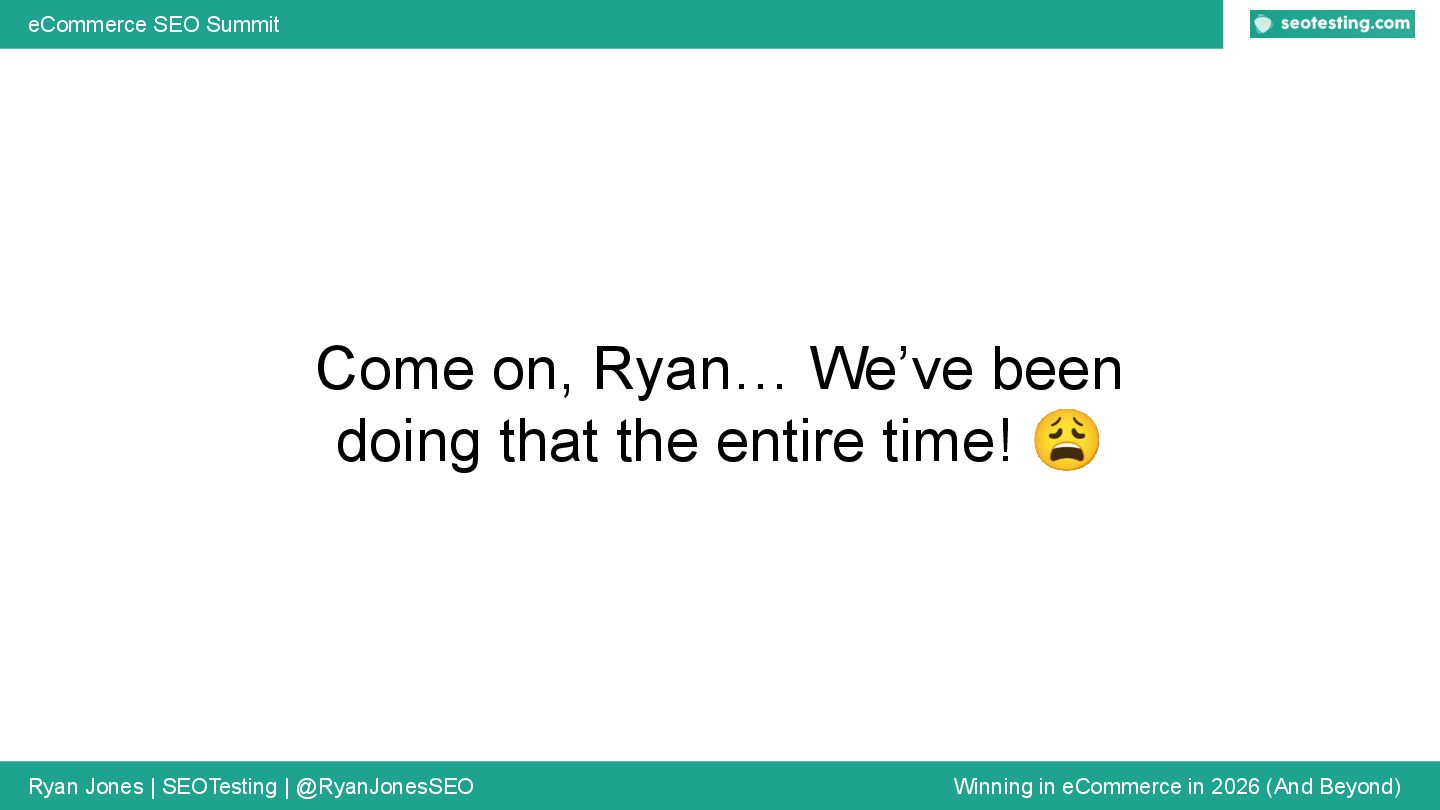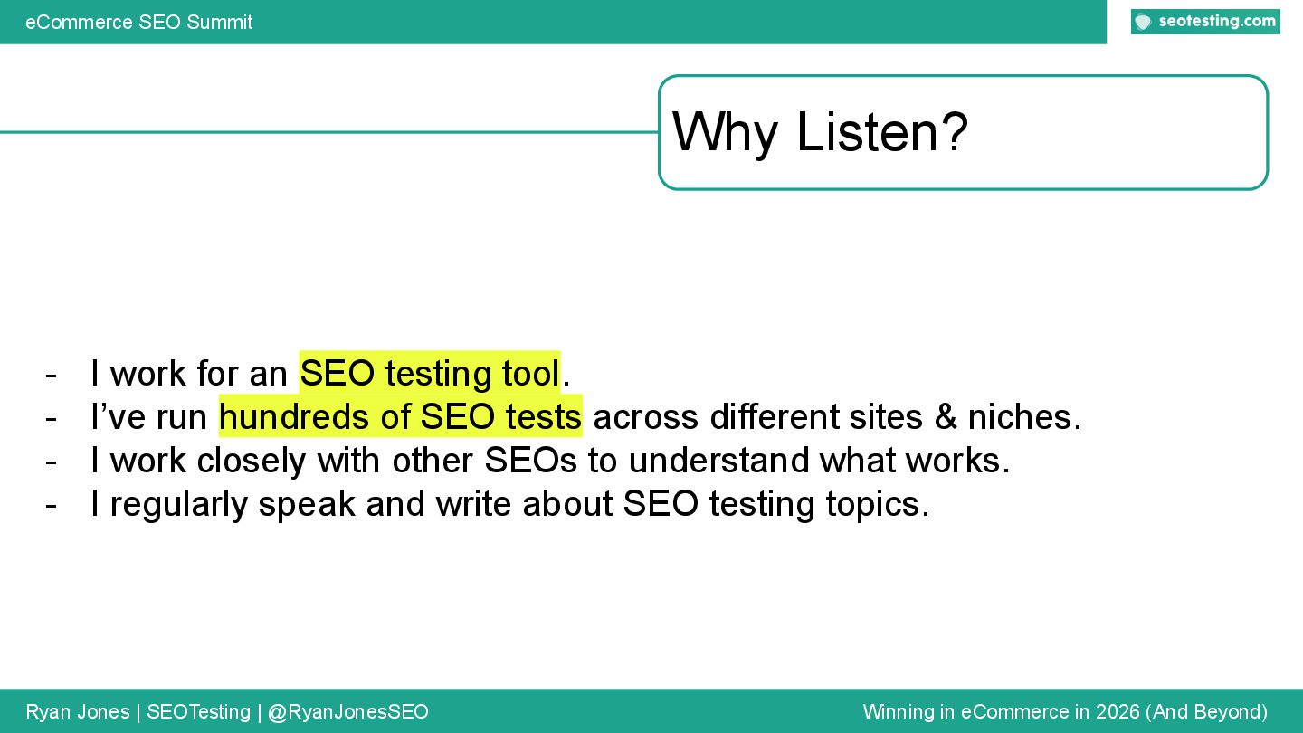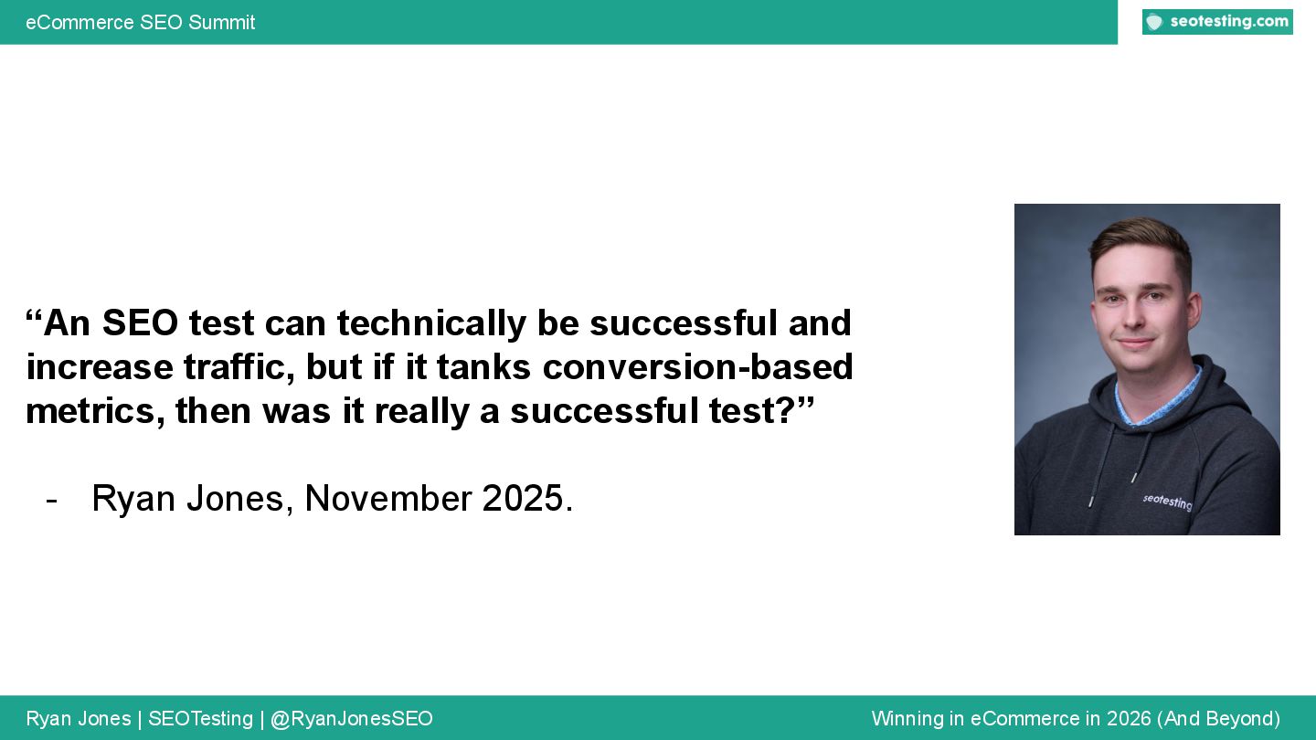 Most eCommerce teams are stuck on the SEO Hamster Wheel — constantly making changes, hoping something works, and struggling to prove what actually moved the needle. In this talk, Ryan Jones (SEOTesting) breaks down the three biggest challenges SEOs face today: lack of time, the “black box” of Google, and the constant pressure to justify impact to stakeholders.