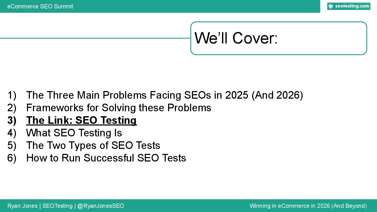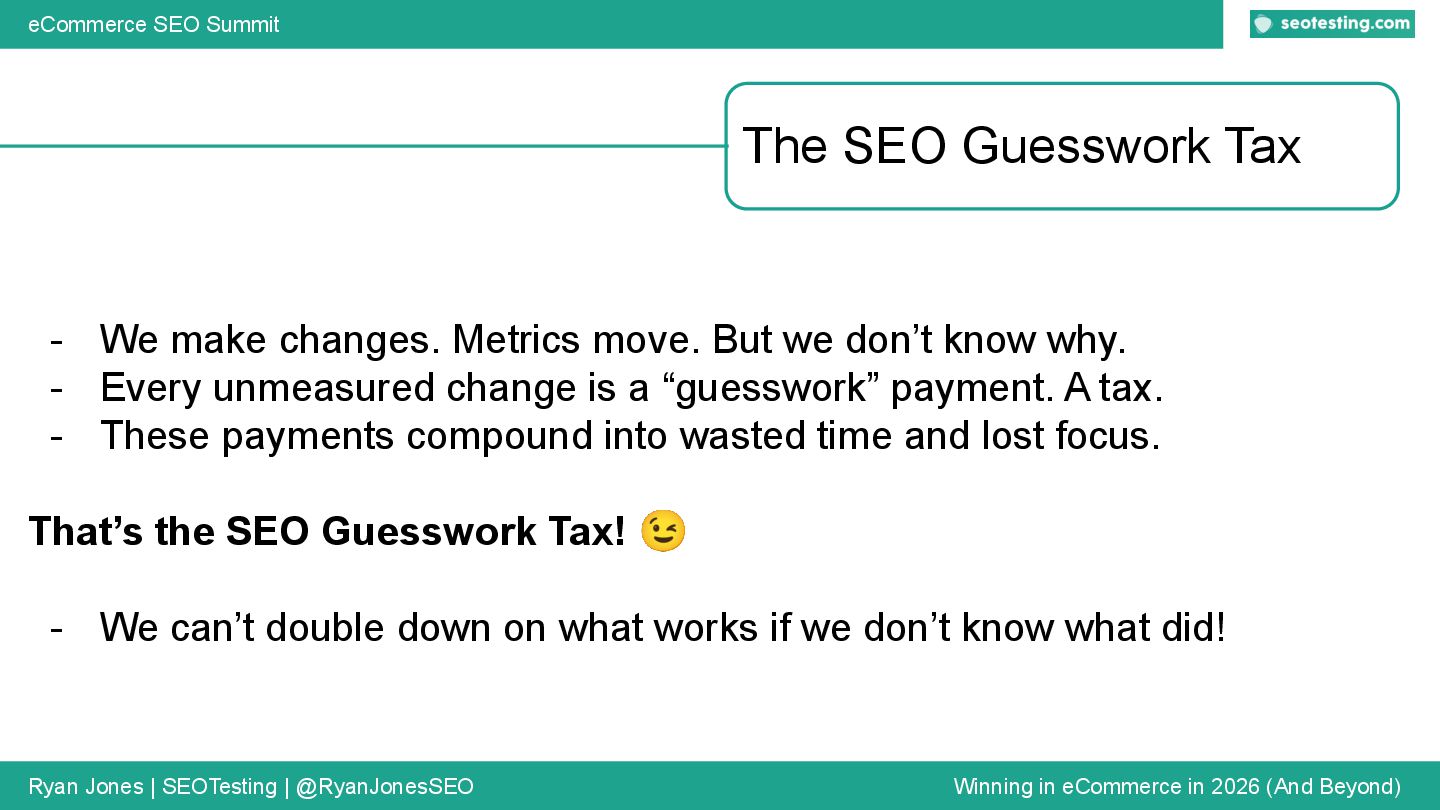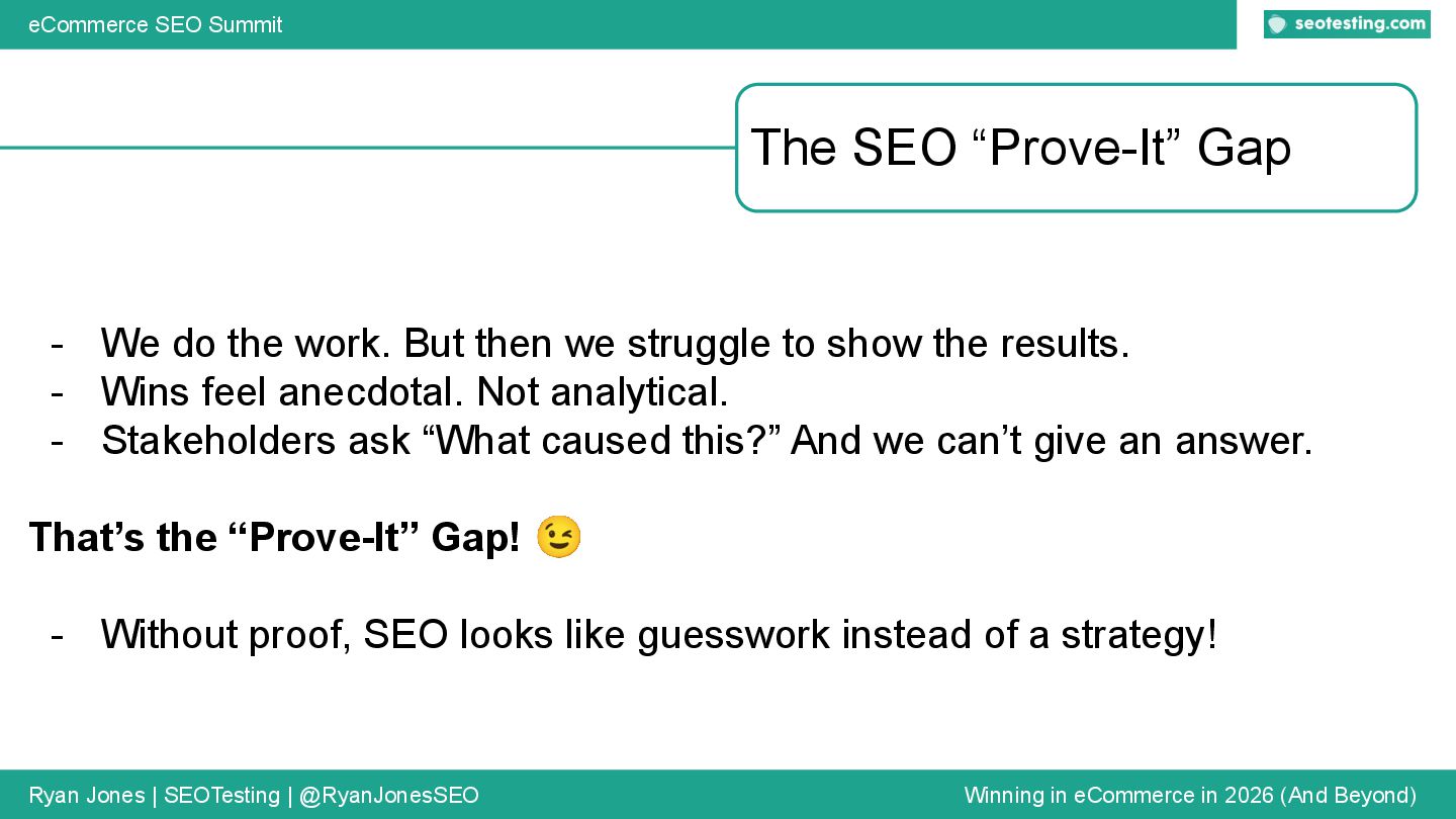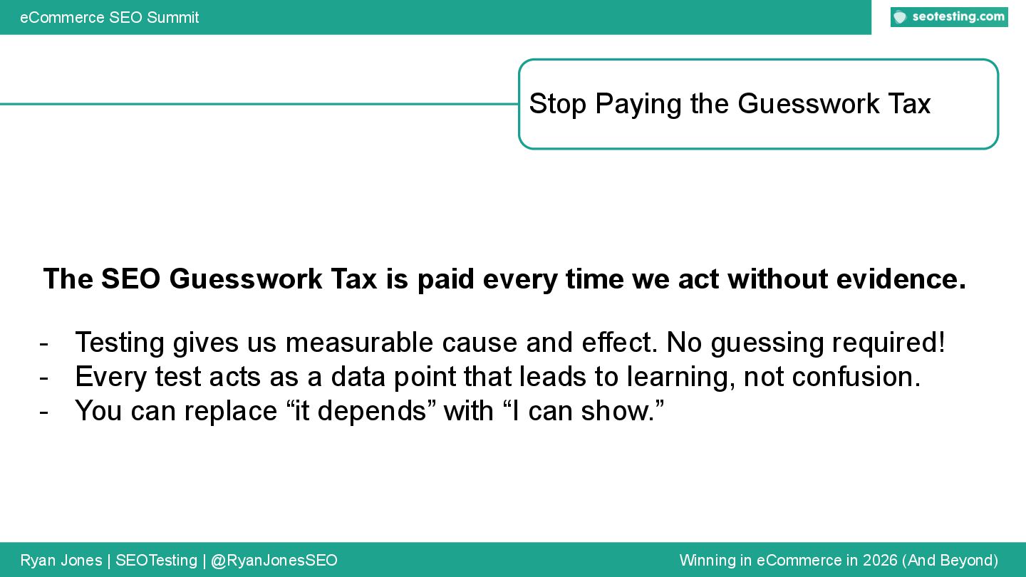 You'll learn practical frameworks to escape guesswork, eliminate the SEO Guesswork Tax, close the “Prove-It” Gap, and run SEO tests that translate directly into revenue gains — not just vanity metrics like clicks or rankings.