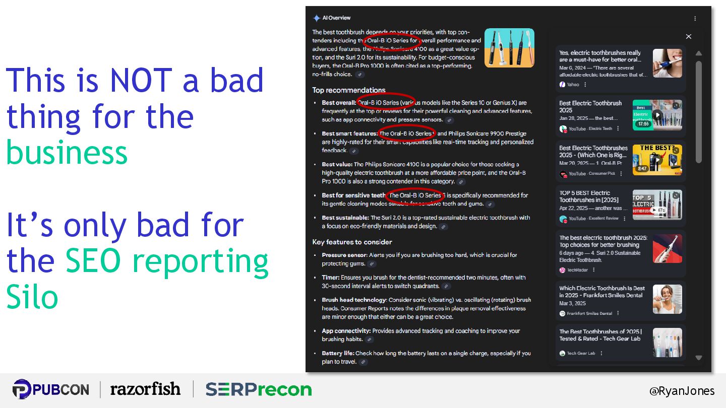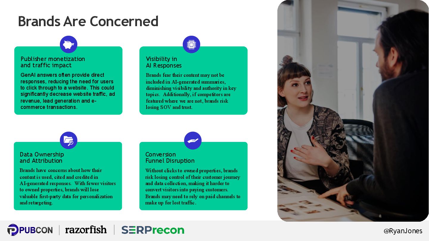 direct responses, reducing the need for users to click through to a website. This could significantly decrease website traffic, ad revenue, lead generation and e- commerce transactions. Visibility in AI Responses Brands fear their content may not be included in AI-generated summaries, diminishing visibility and authority in key topics. Additionally, if competitors are featured where we are not, brands risk losing SOV and trust. Data Ownership and Attribution Brands have concerns about how their content is used, cited and credited in AI-generated responses. With fewer visitors to owned properties, brands will lose valuable first-party data for personalization and retargeting. Conversion Funnel Disruption Without clicks to owned properties, brands risk losing control of their customer journey and data collection, making it harder to convert visitors into paying customers. Brands may need to rely on paid channels to make up for lost traffic. Brands Are Concerned