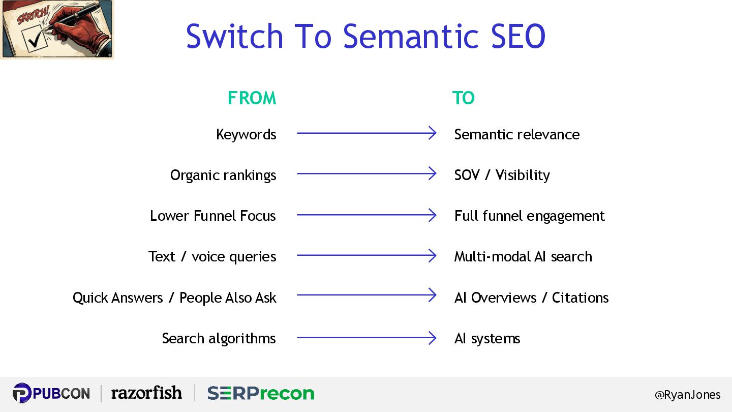SOV / Visibility Keywords Organic rankings Lower Funnel Focus FROM Multi-modal AI search AI Overviews / Citations Quick Answers / People Also Ask TO AI systems Search algorithms Text / voice queries