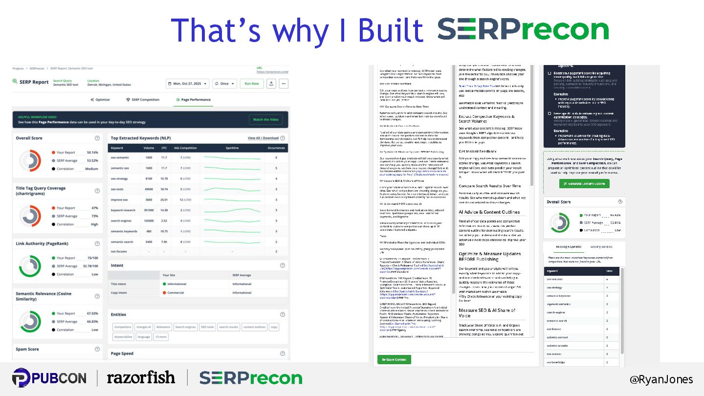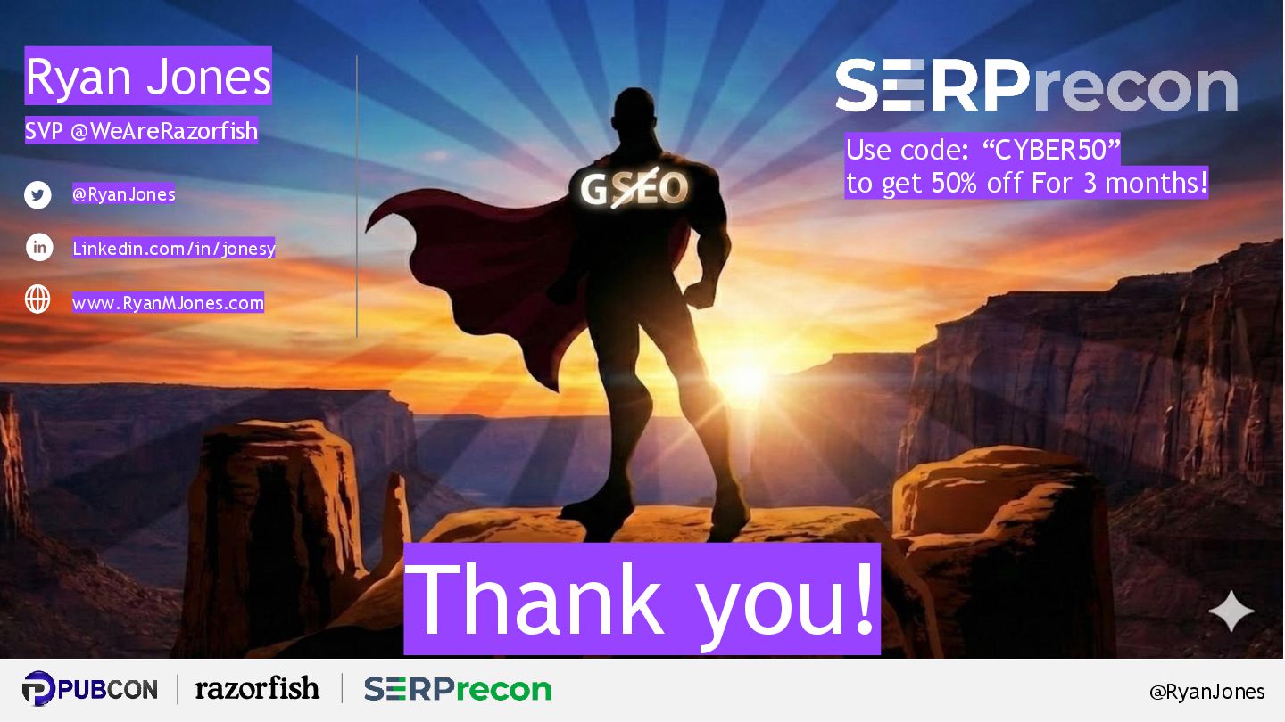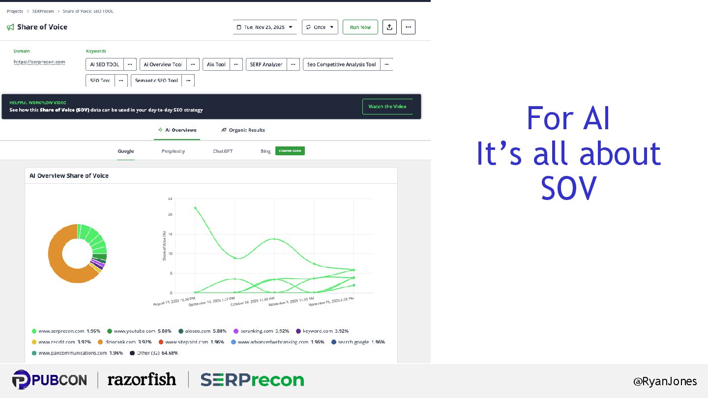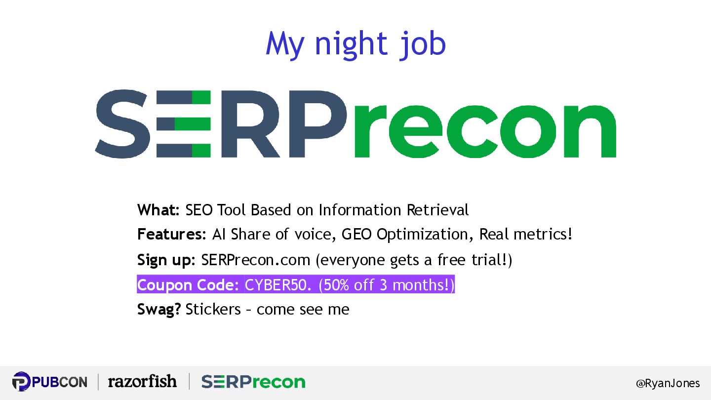 Retrieval Features: AI Share of voice, GEO Optimization, Real metrics! Sign up: SERPrecon.com (everyone gets a free trial!) Coupon Code: CYBER50. (50% off 3 months!) Swag? Stickers – come see me
